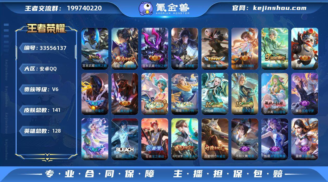 安卓Q-V6-最强王者段位-127英雄-141皮肤-9传说-41史诗 【传说皮肤】:马超神骥逐星野,云缨幻光神枪,桑启鸣野蒿,后羿无尽星芒,铠绛天战甲,曜云鹰飞将,李信一念神魔,梦奇胖达荣荣,宫本武藏地狱之眼 【限定皮肤】:姜子牙天穹之誓,狄仁杰阴阳师,赵云皇家上将,孙尚香蔷薇恋人,高渐离玩趣恶龙,马可波罗山海玄木吟,狄仁杰魔术师,项羽海滩派对,后羿无尽星芒,李元芳银河之约,李元芳云中旅人,鬼谷子五谷丰年,百里守约朱雀志,梦奇顽趣,沈梦溪大漠名商,裴擒虎李小龙,裴擒虎擒涛扼浪,鲁班大师探海日志,桑启海盐诗旅,阿古朵江河有灵,张良古海寻踪,鬼谷子天穹祈灯,刘邦剑破天穹,程咬金群星魔术团 【年限皮肤】:百里守约朱雀志,马可波罗山海玄木吟 【赛季限定】:沈梦溪大漠名商,李元芳云中旅人,桑启海盐诗旅,裴擒虎擒涛扼浪,鲁班大师探海日志,张良古海寻踪,鬼谷子天穹祈灯,刘邦剑破天穹,姜子牙天穹之誓,东皇太一噬灭天穹,太乙真人谧流熔炉,钟馗虚灵犬护,甄姬逆浪荇歌,亚瑟荣光之誓,梦奇顽趣 【战令限定】:李元芳银河之约,亚连破空之剑,孙悟空神迹守卫,周瑜线条小狗,小乔线条小狗 【史诗皮肤】:周瑜线条小狗,小乔线条小狗,少司缘巫礼...
