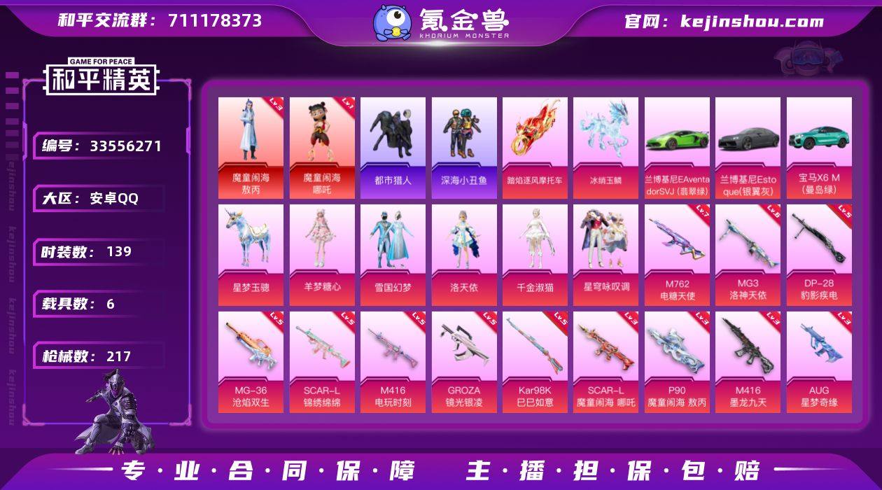 安卓 手Q-3神装-5粉装-14特效枪-6载具-14粉色飞行器-82739热力值-11王牌印记-139套装-217枪皮 【红色神装等级】:暮色玫影-艾丽娅(一级),魔童闹海-敖丙(三级),魔童闹海-哪吒(一级) 【红色角色神装】:暮色玫影-艾丽娅,魔童闹海-敖丙,魔童闹海-哪吒 【热门品类】:粉装-雪国幻梦,套装-都市猎人,套装-深海小丑鱼,套装-小丑鱼 【粉色套装】:粉装-雪国幻梦,角色-洛天依,角色-千金淑猫,粉装-星穹咏叹调,角色-羊梦糖心 【粉色枪皮等级】:AKM-暮色玫影(三级),SCAR-L-锦绣绵绵(五级),SCAR-L-魔童闹海 哪吒(三级),M416-电玩时刻(五级),M416-墨龙九天(三级),GROZA-镜光银凌(五级),AUG-星梦奇缘(三级),M762-电糖天使(七级),P90-魔童闹海 敖丙(三级),Kar98K-巳巳如意(五级),DP-28-豹影疾电(五级),MG3-洛神天依(六级),MG-36-沧焰双生(五级),M338-回旋牧梦使(三级) 【粉色载具】:兰博基尼Aventador SVJ(翡翠绿),兰博基尼Estoque(银翼灰),宝马X6 M(曼岛绿),踏焰逐风摩托车,僚机-冰龙团团,星梦玉骢,冰绡玉鳞 【粉色枪皮】:AKM-暮色玫影,SCAR-L-锦绣绵绵,SCAR-L-魔童闹海 哪吒,M416-电玩时刻,M416-墨龙九天,GROZA-镜光银凌,AUG-星梦奇缘,M762-...