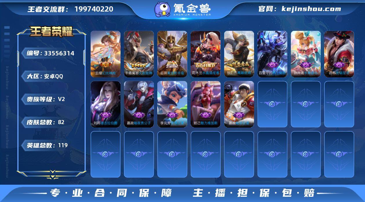 V2 4传说 119英雄 82皮肤 可二次 可修改实名 女号
