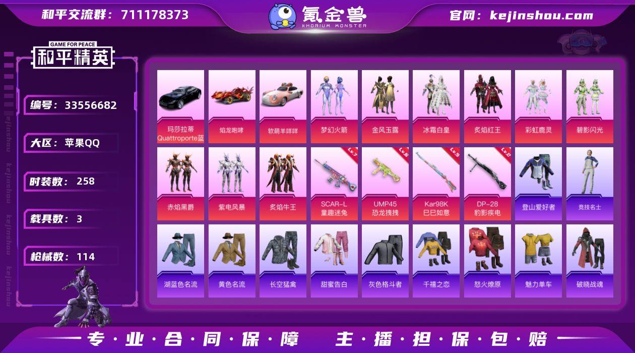 实名: 可修改 时装数: 258 载具数: 3 枪械数: 114 战备数: 3 热门装扮: 梦幻火箭(新101),金风玉露,炙焰红王,冰霜白皇,彩虹鹿灵,碧影闪光,炙焰牛王,紫电风暴,赤焰黑爵 载具: 焰龙咆哮,软萌羊咩咩,玛莎拉蒂Quattroporte(夜幕蓝) 稀有枪皮: SCAR-L童趣迷兔,UMP45恐龙拽拽,Kar98K-巳巳如意,DP-28-豹影疾电 亮点: 【优质装备】:萌熊伴侣背包(粉熊背包),七级SCAR-L-童趣迷兔