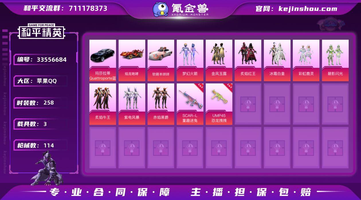 9粉装 4特效枪 3载具 6印记 可二次 可修改实名 【热门装扮】梦幻火箭(新101) ,金风玉露,炙焰红王,冰霜白皇,彩虹鹿灵,碧影闪光,炙焰牛王,紫电风暴,赤焰黑爵 【载具】玛莎拉蒂Quattroporte(夜幕蓝),焰龙咆哮,软萌羊咩咩 【稀有枪皮】Kar98K-巳巳如意,DP-28-豹影疾电,SCAR-L童趣迷兔,UMP45恐龙拽拽 【七级特效枪】七级SCAR-L-童趣迷兔 【六级特效枪】六级UMP45-恐龙拽拽 【五级特效枪】五级Kar98K-巳巳如意 【二级特效枪】二级DP-28-豹影疾电 【紫色装扮】探宝勇士,夏日音浪,千禧之恋,幻世战舞者,怒火燎原,湖蓝色名流,破蛋小黄鸡,甜蜜告白,登山爱好者,破晓战魂,灰色格斗者,炫蓝之夏,娇憨猪猪,萌趣咩咩,SS21特训,绚烂繁星,熠彩粉晶,田园牧歌,军刀雅典娜,浓情蜜辣,豚鼠丹丹,雪兔飞飞,茉莉之诺,风铃甜诗,飞驰魅影,音速流光,SS19特训,英勇保护者,SS20特训,甜心亚梦,虚音幻奏,轻风白浪,幻彩翩翩,SS22特训,SS23特训,SS31特训套装,缤纷果语,霓虹极客,长空猛禽,魅力单车,荷畔雨呱,黄色名流,龙的传人,冰河战士,龙魂突击队,蝶变,SS18特训,李逍遥,竞技名士,街头风暴,SS29特训,SS32特训套装,玉兔迎春,TEC追光队服,深海梦境,粉红小猪,神气柴柴,SS24特训(SS24特训套装),锦衣飞扬,SS25特训,粉雾...