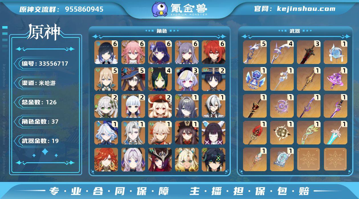 126黄!6+5夜兰!6+1雷电将军!6+1八重神子!0+5甘雨!纳塔战舰! 龙芙万希!仆人融化队!月绽放!满命迪卢克!满命刻晴!五命莫娜!五命琴 ! 四命提纳里 !三命七七!2+1神里绫华!二命可莉!二命纳西妲!二命流浪者 ! 1+1菈乌玛!1+1胡桃!一命那维莱特!一命芙宁娜!一命阿蕾奇诺!一命枫原万叶!优菈!宵宫!钟离!阿贝多!魈!珊瑚宫心海!0+1荒泷一斗!迪希雅!闲云!希格雯!玛拉妮!基尼奇!希诺宁!恰斯卡!玛薇卡!0+1茜特菈莉!0+1少女!5精武器: 若水 4精武器: 阿莫斯之弓 3精武器: 狼的末路 1精武器: 雾切之回光!四风原典!天空之傲!尘世之锁!天空之脊!护摩之杖!薙草之稻光!不灭月华!赤角石溃杵!神乐之真意!猎人之径!赤沙之杖!柔灯挽歌!祭星者之望!帷间夜曲 亮点: tap已注销