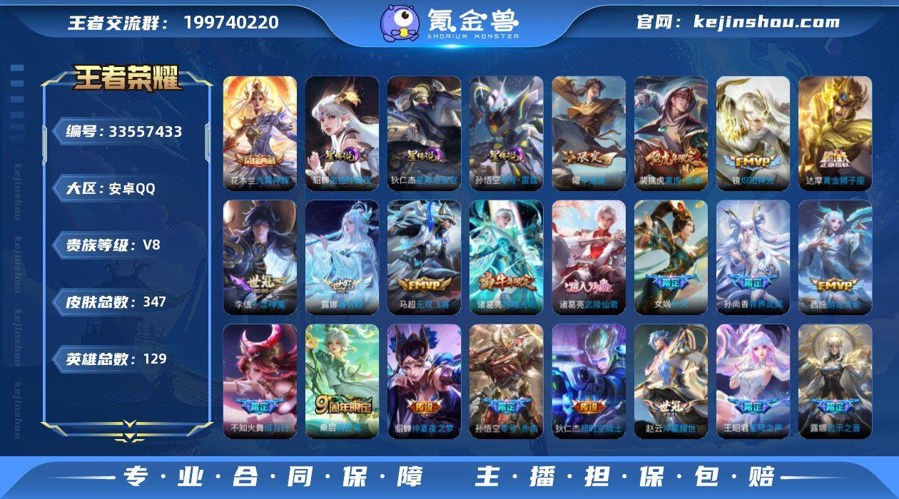 高质量皮肤号 限定多多 安卓Q-V8-永恒钻石I段位-129英雄-347皮肤-1典藏皮肤-23传说-108史诗 【英雄全皮】:戈娅全皮 【荣耀典藏】:花木兰九霄神辉 【传说皮肤】:桑启鸣野蒿,露娜霜月吟,不知火舞绯月行,王昭君星穹之声,马超无双飞将,露娜启示之音,女娲补天,裴擒虎寅虎赤拳,孙尚香异界灵契,赵云淬星耀世,王昭君乞巧织情,西施游龙清影,曜李逍遥 ,诸葛亮时雨天司,镜炽阳神光,虞姬启明星使,孙悟空零号赤焰,李信一念神魔,虞姬云霓雀翎,达摩黄金狮子座,诸葛亮武陵仙君,貂蝉仲夏夜之梦,狄仁杰超时空战士 【限定皮肤】:白起狰,姜子牙天穹之誓,狄仁杰阴阳师,虞姬凯尔特女王,赵云皇家上将,墨子神迹守卫,孙尚香蔷薇恋人,孙尚香异界灵契,庄周蜃楼王,庄周高山流水,高渐离死亡摇滚,钟无艳超时空战士,孙膑妖精王,扁鹊炼金王,扁鹊奇幻香踪,白起夜都怪侠,芈月重明,芈月白晶晶,芈月幻夜卜梦,吕布猎兽之王,周瑜赤莲之焰,元歌云间偶戏,元歌无心,夏侯惇朔风刀,甄姬女儿国国王,甄姬游园惊梦,甄姬落雪兰心,曹操烛龙,典韦穷奇,马可波罗逐梦之星,马可波罗暗影游猎,狄仁杰魔术师,狄仁杰万华元夜,达摩星际陆战队,达摩沙漠行僧,项羽海滩派对,...