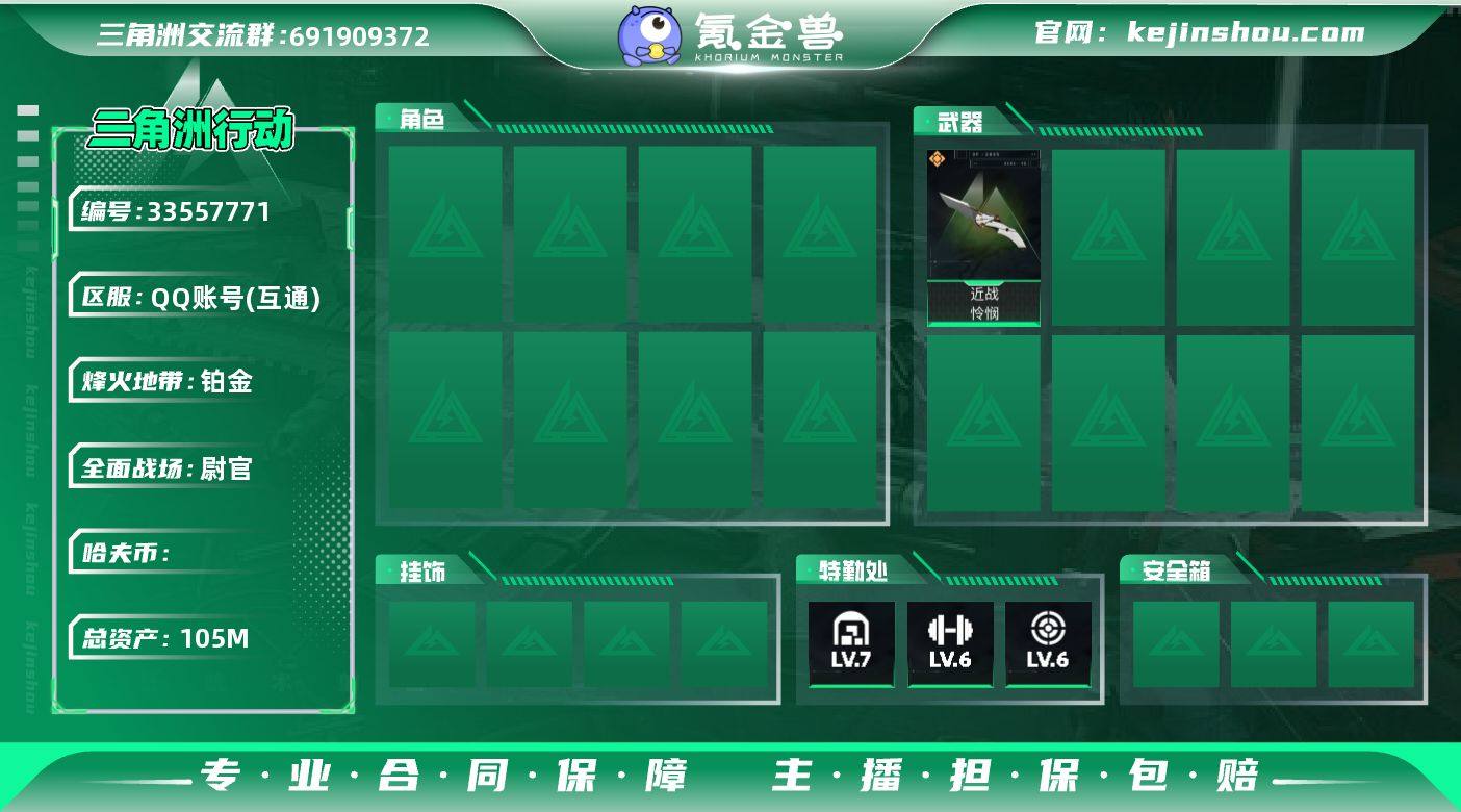 [18845425]总资产:105M 1干员外观 2近战传说 21传说枪械 哈夫币:20.979K 不可二次 不可修改实名 【烽火地带段位】钻石 【全面战场段位】尉官 【干员外观】威龙-凌霄戍卫 【传说武器皮肤】近战武器-暗星,近战-怜悯,SCAR-H战斗步枪-启航,KC17突击步枪-点翠,PSG-1射手步枪-点翠,SG552突击步枪-点翠,M14射手步枪-缄花,腾龙突击步枪-马年祥瑞,47突击步枪-暗星,SR-3M紧凑突击步枪-暗星,M14射手步枪-蛮荒,QBZ95-1突击步枪-凌霄戍卫,G18-马年祥瑞,SR-25射手步枪-缄花,SCAR-H战斗步枪-茶蘼,PKM通用机枪-茶蘼,SR-3M紧凑突击步枪-茶蘼,勇士冲锋枪-万金泪冠,腾龙突击步枪-万金泪冠,AWM狙击步枪-万金泪冠,.357左轮-缄花
