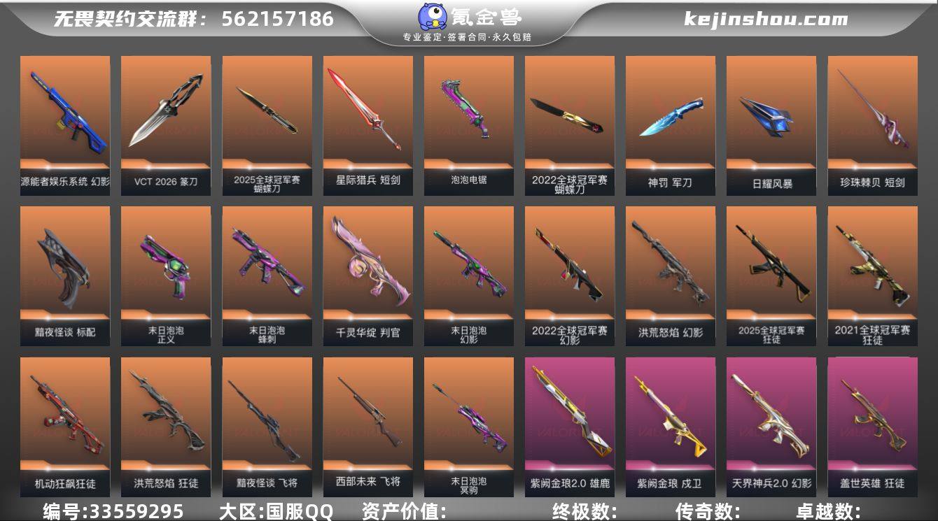 段位: 黄金 亮点皮肤: 狂徒-2021全球冠军赛,幻影-2022全球冠军赛,蝴蝶刀-2022全球冠军赛 套装: 2022全球冠军赛,2025全球冠军赛,末日泡泡套装,VCT 2026队伍礼包 近战武器皮肤: 军刀-神罚,短剑-珍珠棘贝,日耀风暴,泡泡电锯,星际猎兵 短剑,2025全球冠军赛 蝴蝶刀,VCT 2026 篆刀 步枪皮肤: 戍卫-紫阙金琅,狂徒-盖世英雄,狂徒-机动狂飙,幻影-洪荒怒焰,狂徒-洪荒怒焰,幻影-天界神兵2.0,幻影-源能者娱乐系统,幻影-末日泡泡,2025全球冠军赛 狂徒 佩枪皮肤: 标配-黯夜怪谈,正义-末日泡泡,蒙太奇 狂怒 狙击枪皮肤: 飞将-黯夜怪谈,飞将-西部未来,冥驹-末日泡泡 冲锋枪皮肤: 蜂刺-末日泡泡 霰弹枪皮肤: 雄鹿-紫阙金琅2.0,判官-千灵华绽