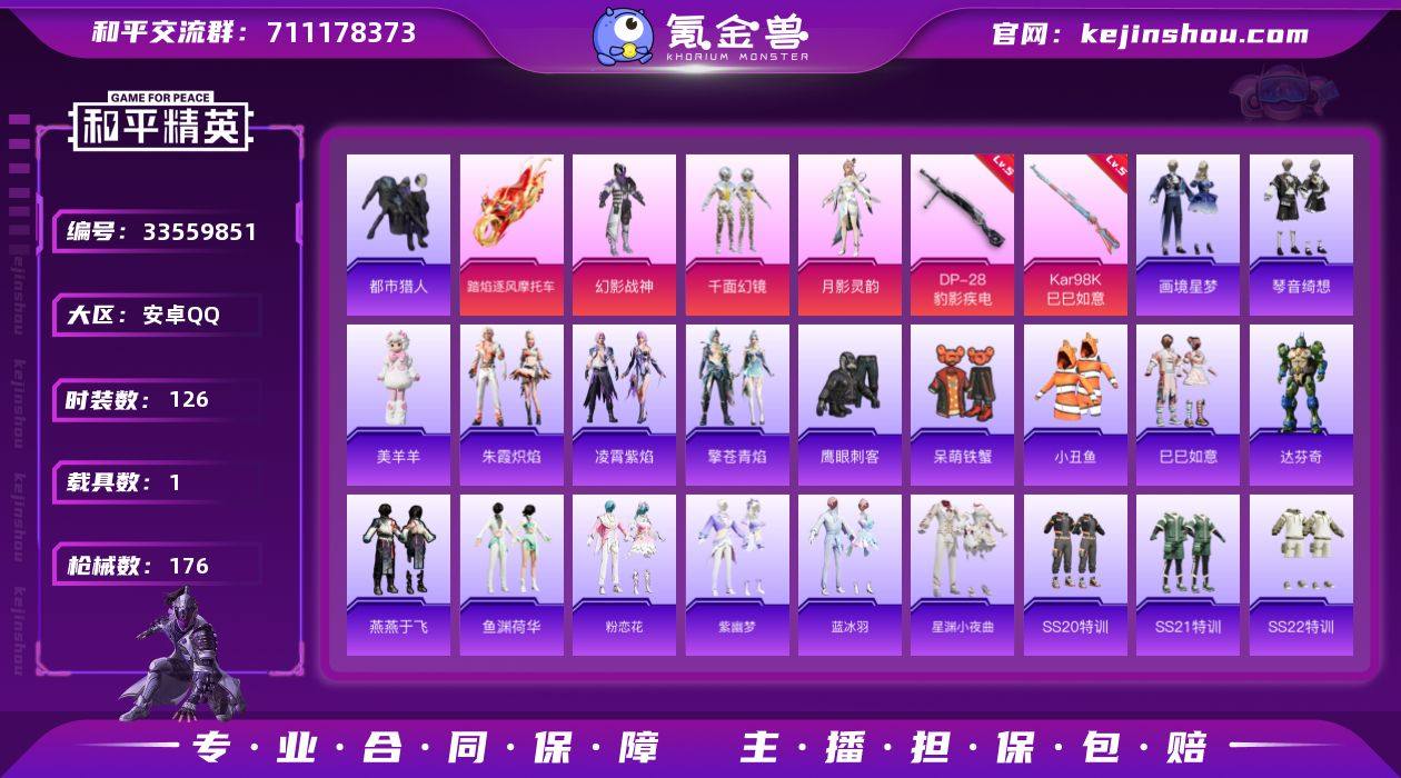 无二次-安卓 手Q-3粉装-4特效枪-1载具-1粉色飞行器-46730热力值-5王牌印记-126套装-176枪皮HZ2641606 【热门品类】:套装-都市猎人,套装-小丑鱼 【粉色套装】:粉装-幻影战神,粉装-千面幻镜,角色-月影灵韵 【粉色枪皮等级】:ACE32-萌骑漫游(五级),Kar98K-巳巳如意(五级),Mk14-福马献瑞(五级),DP-28-豹影疾电(五级) 【粉色载具】:踏焰逐风摩托车 【粉色枪皮】:ACE32-萌骑漫游,Kar98K-巳巳如意,Mk14-福马献瑞,DP-28-豹影疾电 【粉色飞行器】:千面幻镜飞行器 【粉色降落伞】:星之彼岸降落伞,垂柳戏鸭降落伞,彩虹甜喵降落伞,沙丘之主降落伞,江南烟雨降落伞,鬼刀降落伞,绯果甜心降落伞,星穹咏叹调降落伞,喜羊羊与灰太狼降落伞 【稀有套装】:套装-巳巳如意,套装-马上有钱,套装-遗迹猎人,角色-达芬奇,套装-燕燕于飞,套装-鱼渊荷华,套装-粉恋花,套装-紫幽梦,套装-蓝冰羽,套装-星渊小夜曲,套装-朱霞炽焰,套装-凌霄紫焰,套装-擎苍青焰,玩偶服-美羊羊,套装-画境星梦,套装-琴音绮想,套装-雨过天青,套装-红釉青花 【稀有枪皮】:AKM-影袭,AKM-星之彼岸,AKM-星兔领航员,AKM-破晓战魂,AKM-龙的传人,M16A4-幻世战舞者,M16A4-红色方程式,M16A4-...
