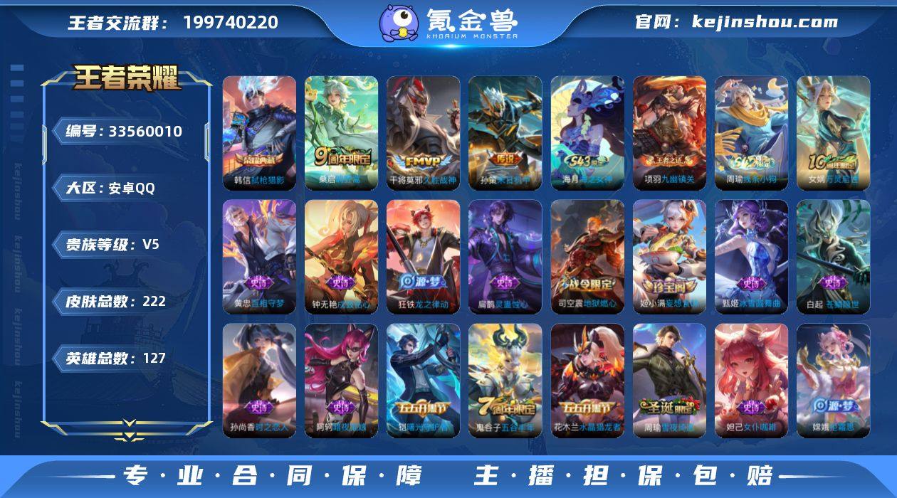 安卓Q-V5-至尊星耀IV段位-127英雄-222皮肤-1典藏皮肤-3传说-63史诗 【荣耀典藏】:韩信弑枪猎影 【传说皮肤】:桑启鸣野蒿,孙策末日机甲,干将莫邪久胜战神 【限定皮肤】:姜子牙天穹之誓,狄仁杰阴阳师,赵云皇家上将,孙尚香蔷薇恋人,庄周高山流水,钟无艳超时空战士,甄姬游园惊梦,甄姬落雪兰心,狄仁杰魔术师,狄仁杰万华元夜,达摩沙漠行僧,项羽海滩派对,程咬金演武夺筹,兰陵王金庭之子,亚瑟潮玩骑士王,后羿圣弓游侠,李元芳云中旅人,钟馗驱傩正仪,干将莫邪真爱魔法,雅典娜黎明之约,鬼谷子原初探秘者,鬼谷子五谷丰年,苏烈千军破阵,梦奇顽趣,沈梦溪大漠名商,裴擒虎擒涛扼浪,云中君纤云弄巧,上官婉儿梁祝,嫦娥拒霜思,鲁班大师探海日志,桑启海盐诗旅,艾琳女武神,艾琳流音漫舞,司空震地狱燃心,阿古朵江河有灵,张良古海寻踪,蒙犽百解令,蒙恬荣光圣徽,鬼谷子天穹祈灯,姬小满妄想食味,沈梦溪龙舞盛年,刘邦剑破天穹,程咬金群星魔术团,周瑜熔金海岸 【赛季限定】:鬼谷子原初探秘者,狄仁杰万华元夜,程咬金演武夺筹,钟馗驱傩正仪,苏烈千军破阵,达摩沙漠行僧,兰陵王金庭之子,沈梦溪大漠名商,李元芳云中旅人,桑启海盐诗旅,裴擒虎擒涛扼...