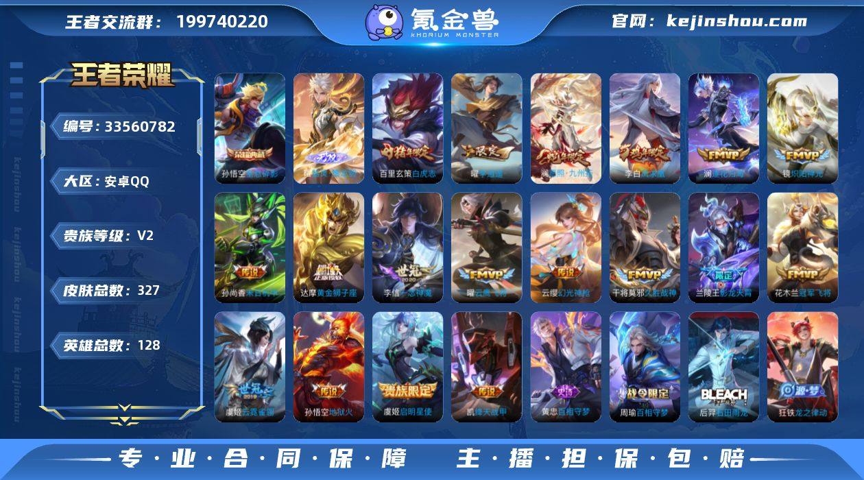 安卓Q-V2-最强王者段位-128英雄-327皮肤-1典藏皮肤-1无双-18传说-95史诗 【英雄全皮】:猪八戒全皮 【荣耀典藏】:孙悟空全息碎影 【无双皮肤】:曜器灵螭龙剑 【传说皮肤】:澜愿照九州拓,云缨幻光神枪,澜逐花归海,兰陵王影龙天霄,曜李逍遥 ,铠绛天战甲,镜炽阳神光,虞姬启明星使,曜云鹰飞将,李信一念神魔,干将莫邪久胜战神,虞姬云霓雀翎,达摩黄金狮子座,百里玄策白虎志,花木兰冠军飞将,李白凤求凰,孙尚香末日机甲,孙悟空地狱火 【限定皮肤】:白起狰,狄仁杰阴阳师,虞姬凯尔特女王,赵云皇家上将,赵云引擎之心,赵云龙胆,嬴政优雅恋人,嬴政白昼王子,孙尚香蔷薇恋人,鲁班七号狮舞东方,庄周蜃楼王,庄周高山流水,高渐离死亡摇滚,钟无艳王者之锤,孙膑妖精王,扁鹊炼金王,芈月重明,吕布猎兽之王,吕布御风骁将,周瑜赤莲之焰,元歌云间偶戏,夏侯惇朔风刀,甄姬游园惊梦,曹操烛龙,典韦穷奇,典韦蓝屏警告,马可波罗暗影游猎,狄仁杰魔术师,狄仁杰万华元夜,达摩沙漠行僧,项羽海滩派对,老夫子醍醐杖,关羽冰锋战神,貂蝉逐梦之音,程咬金演武夺筹,露娜一生所爱,韩信逐梦之影,韩信傲雪梅枪,兰陵王影龙天霄,兰陵王驯魔猎人,兰陵王金庭之子...
