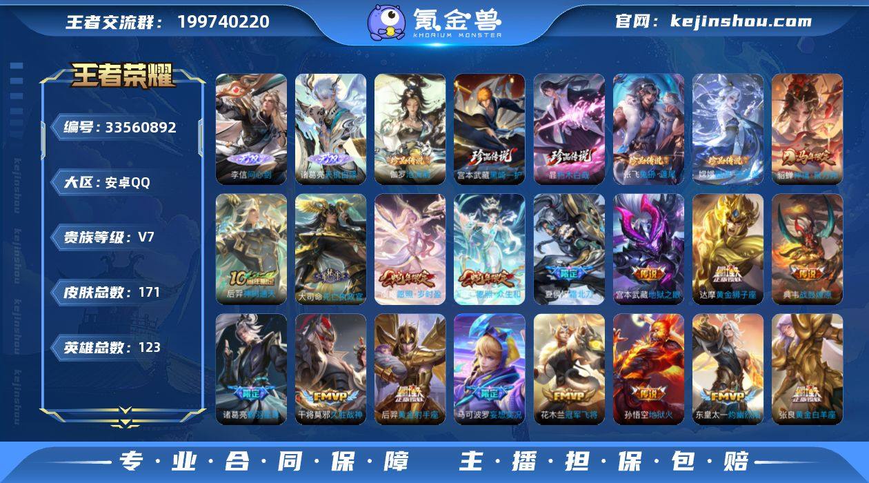 安卓Q-V7-永恒钻石II段位-123英雄-171皮肤-2无双-5珍品传说-19传说-51史诗 【无双皮肤】:李信问心剑,诸葛亮天机白泽 【珍品传说】:伽罗沧流箭,宫本武藏黑崎一护,暃朽木白哉,张飞兔狲蓬尾,嫦娥器灵落星盏 【传说皮肤】:貂蝉神骥聚万邦,后羿神树通天,大司命死亡执政官,妲己愿照众生和,虞姬愿照岁时盈,夏侯惇霜北刀,典韦战鼓燎原,马可波罗妄想实况,东皇太一灼幽烈阳,诸葛亮鹤羽星尊,周瑜音你心动,铠绛天战甲,张良黄金白羊座,干将莫邪久胜战神,达摩黄金狮子座,花木兰冠军飞将,后羿黄金射手座,宫本武藏地狱之眼,孙悟空地狱火 【限定皮肤】:夏侯惇霜北刀,狄仁杰阴阳师,赵云皇家上将,孙尚香蔷薇恋人,芈月重明,甄姬游园惊梦,曹操烛龙,典韦穷奇,马可波罗妄想实况,狄仁杰魔术师,项羽海滩派对,老夫子醍醐杖,程咬金演武夺筹,牛魔御旌,钟馗驱傩正仪,太乙真人饕餮,鬼谷子原初探秘者,诸葛亮鹤羽星尊,明世隐疑决卦,狂铁御狮,米莱狄御霄,盾山御銮,戈娅驭风魔法,阿古朵江河有灵,张良古海寻踪 【年限皮肤】:妲己愿照众生和,虞姬愿照岁时盈 【赛季限定】:太乙真人饕餮,曹操烛龙,芈月重明,典韦穷奇,狂铁御狮,米莱狄御霄,牛魔御旌,盾...