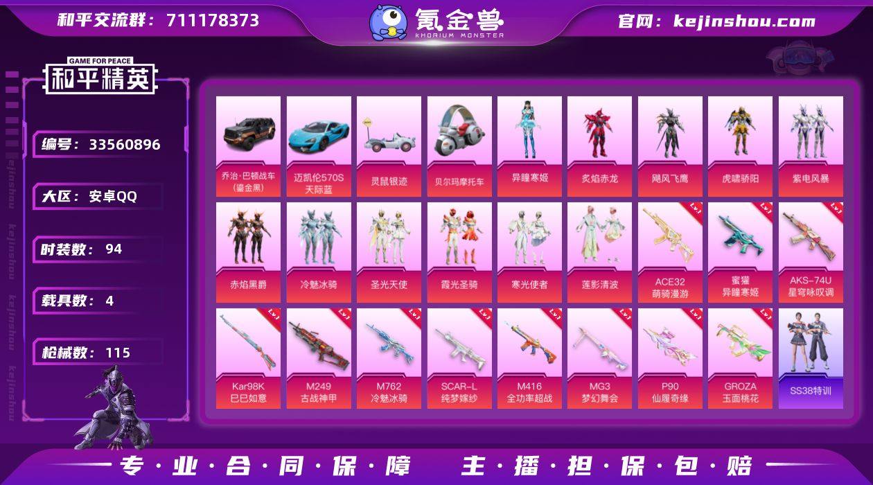 【5载具11粉装11特效枪 秒换绑不用等】 安卓Q区-48435热力值-94套装-115枪皮 【5载具】 灵鼠银迹 迈凯伦570S(天际蓝) 乔治·巴顿战车(鎏金黑) 布尔玛摩托车 僚机-萌兔起飞【11粉装】 圣光天使 寒光使者 莲影清波 霞光圣骑 虎啸骄阳 炙焰赤龙 飓风飞鹰 紫电风暴 赤焰黑爵 冷魅冰骑 角色-异瞳寒姬【11特效枪】 GROZA-玉面桃花(6级) P90-仙履奇缘(6级) M416-全功率超战(4级) ACE32-萌骑漫游(3级) SCAR-L-纯梦嫁纱(4级) MG3-梦幻舞会(4级) M249-古战神甲(4级) M762-冷魅冰骑(4级) 蜜獾-异瞳寒姬(4级) Kar98K-巳巳如意(5级) AKS-74U-星穹咏叹调(4级)【108热门】 军刀雅典娜 SS27特训 SS26特训 SS25特训 SS24特训 SS23特训 AWM-飒粉甜心 M762-天降萌叽 Mk47-乌木金纹 M249-彩虹符号 MG3-幻世战舞者 AKM-星之信仰 AUG-圣光天使 破蛋小黄鸡 长空猛禽 青涩时光 妙红点点 懵萌河马 魅力单车 六六大吉 黄色运动 S686-奇异狩猎者 海岛探路者 平底锅-画境星梦 AWM-暮色玫影 MG-36-薄荷星砂 GROZA-福马献瑞 恋语绒绒 SS34特训 撬棍-冰晶雪宝 AWM-天降萌叽 大橘大利 超能元气 燃点复合弓-罪夜之冕 SS29特训 破片手榴弹-爆破雪人 SS30特训 ACE32-冰晶雪宝 青翼流星 SS28特训 PKM-啾咪啾咪 海盐...
