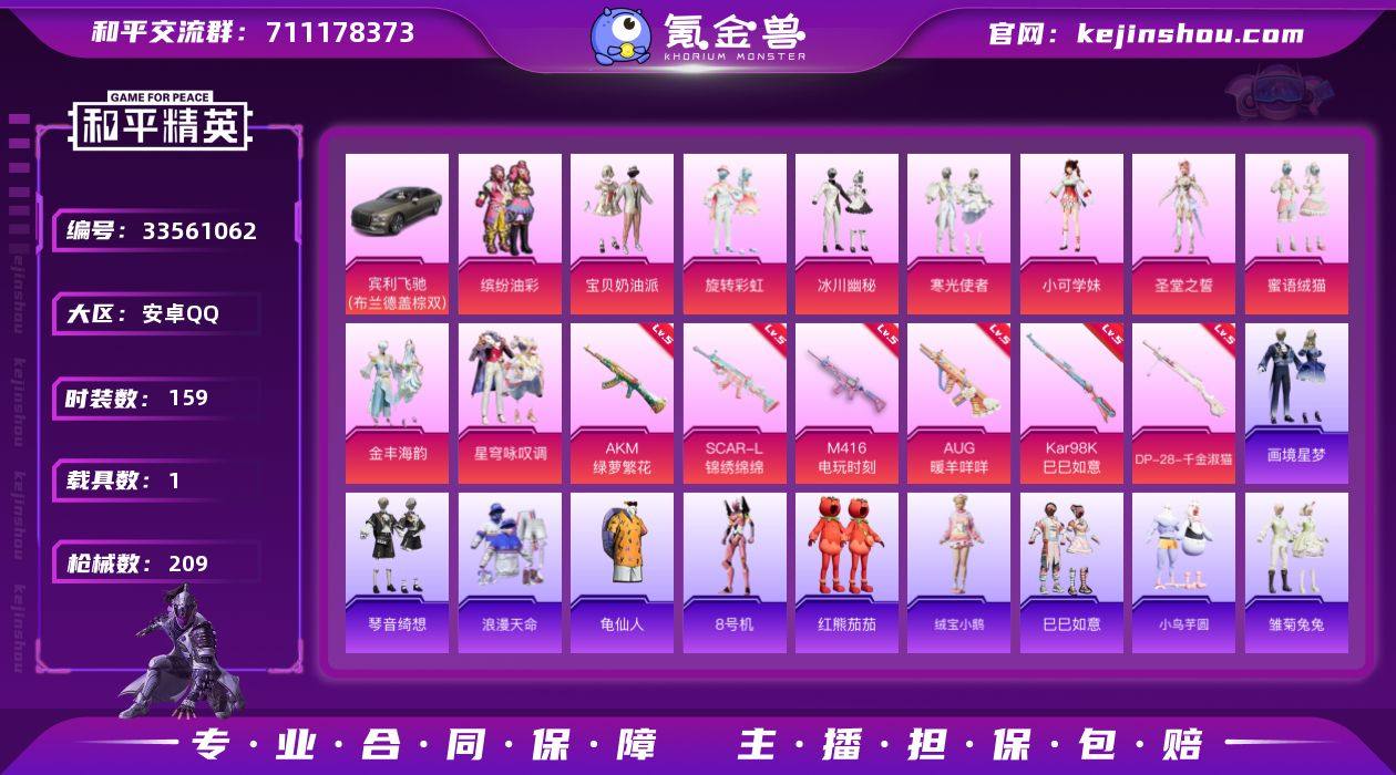 安卓【小号/11王牌印记/缤纷油彩/蓝螳螂/10粉装-6特效枪-1载具-3粉色飞行器】 手Q--67397热力值-11王牌印记-159套装-209枪皮 【热门品类】:粉装-缤纷油彩,套装-浪漫天命,套装-龟仙人,角色-8号机,套装-红熊茄茄 【粉色套装】:粉装-宝贝奶油派,粉装-缤纷油彩,粉装-旋转彩虹,粉装-冰川幽秘,粉装-寒光使者,角色-小可学妹,角色-圣堂之誓,粉装-蜜语绒猫,粉装-金丰海韵,粉装-星穹咏叹调 【粉色枪皮等级】:AKM-绿萝繁花(五级),SCAR-L-锦绣绵绵(五级),M416-电玩时刻(五级),AUG-暖羊咩咩(五级),Kar98K-巳巳如意(五级),DP-28-千金淑猫(五级) 【粉色载具】:宾利飞驰(布罗德盖棕双色) 【粉色枪皮】:AKM-绿萝繁花,SCAR-L-锦绣绵绵,M416-电玩时刻,AUG-暖羊咩咩,Kar98K-巳巳如意,DP-28-千金淑猫 【粉色飞行器】:天之羽翼飞行器,萌物绒绒飞行器,凤舞九天飞行器 【粉色降落伞】:旋转彩虹降落伞,暗夜鎏金降落伞,第五大道降落伞,仲夏莫吉托降落伞,闲梦青缨降落伞,萌物绒绒降落伞,蜜语绒猫降落伞,鸢尾晶梦降落伞,金丰海韵降落伞,千金淑猫降落伞,鬼刀降落伞,绯果甜心降落伞,星穹咏叹调降落伞,幻彩电音降落伞,冷漠罗丽降落伞 【稀有套装】:套装-龟...