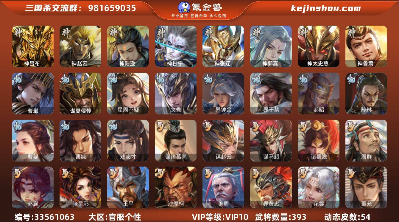 标题:S37268 【支持分期】 VIP等级:VIP10 官阶:大将军 史诗武将数量:60 动态皮肤数量:54 史诗宝珠数量:2 将魂数量:6767 雁翎数量:83867 心愿积分:2316 史诗武将(魏国):文鸯,曹髦,曹婴,界钟会,戏志才,清河公主,司马昭,星周不疑,谋夏侯惇,陈琳,界于禁,程昱,曹纯,郝昭 史诗武将(蜀国):谋诸葛亮,谋赵云,沙摩柯,周群,花鬟,谯周,张星彩,王平,诸葛瞻,界黄忠,马云禄,董允,赵襄,谋马超 史诗武将(吴国):界徐盛,留赞,骆统,势太史慈,周处,界朱然,文鸯 史诗武将(群雄):十常侍,星董卓,杨彪,界左慈,张琪瑛,许攸,刘璋,麹义,司马昭,谋张角,界李儒,星黄忠,界沮授,张让,卑弥呼,左慈,兀突骨,沮授,公孙康 史诗武将(神将):神郭嘉,神甘宁,神鲁肃,神太史慈,神赵云,神陆逊,神吕布,神张辽