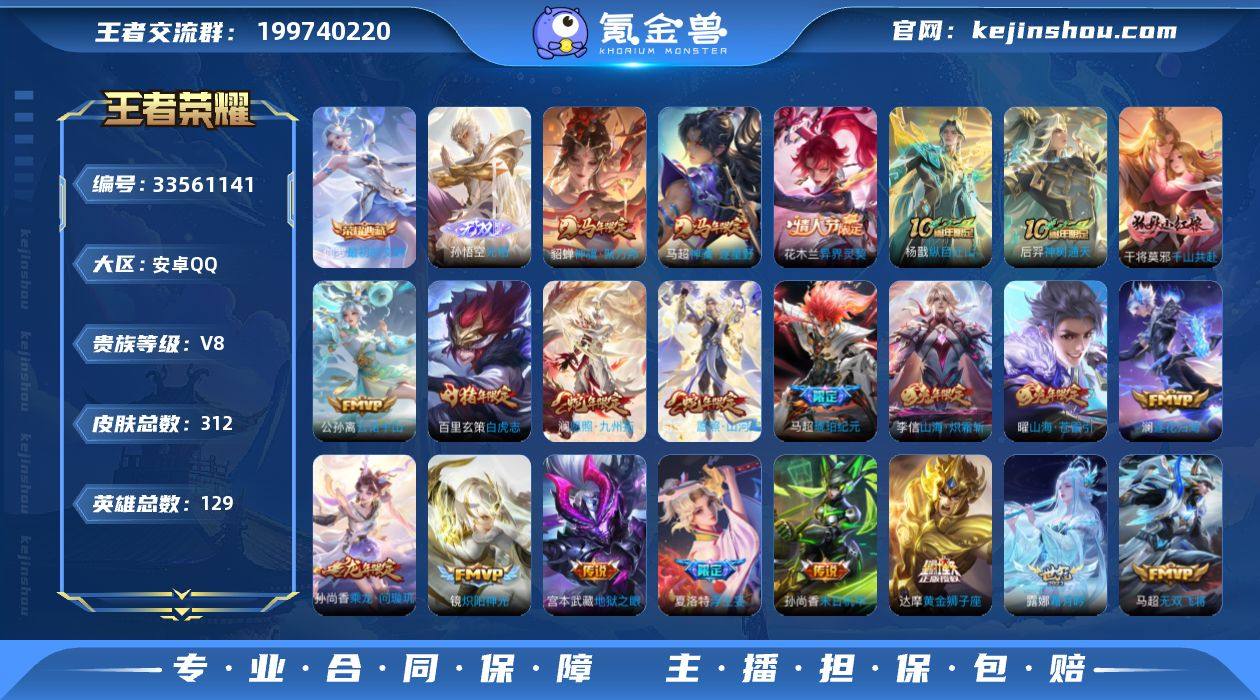 安卓Q-V8-至尊星耀II段位-129英雄-312皮肤-1典藏皮肤-1无双-32传说-78史诗 【英雄全皮】:孙权全皮,苍全皮,马超全皮,敖隐全皮,夏洛特全皮,戈娅全皮,空空儿全皮,影全皮 【荣耀典藏】:伽罗最初的交响 【无双皮肤】:孙悟空无相 【传说皮肤】:貂蝉神骥聚万邦,马超神骥逐星野,花木兰异界灵契,杨戬纵目迁山,后羿神树通天,干将莫邪千山共赴,公孙离云诺千山,司空震愿照山河定,澜愿照九州拓,云缨幻光神枪,裴擒虎祥瑞亨通,桑启鸣野蒿,孙尚香乘龙问璇玑,马超琥珀纪元,澜逐花归海,露娜霜月吟,马可波罗妄想实况,夏洛特浮生妄,小乔山海琳琅生,曜山海苍雷引,李信山海炽霜斩,橘右京枫霜尽,马超无双飞将,镜炽阳神光,虞姬启明星使,干将莫邪久胜战神,达摩黄金狮子座,百里玄策白虎志,貂蝉仲夏夜之梦,孙尚香末日机甲,宫本武藏地狱之眼,狄仁杰超时空战士 【限定皮肤】:暃埋骨钱,蒙犽顽岩魄,蔡文姬夏日便利店,虞姬夏日便利店,姜子牙天穹之誓,杨戬破阵退雄兵,李白谪仙醉月,狄仁杰阴阳师,小乔山海琳琅生,赵云皇家上将,高渐离死亡摇滚,元歌云间偶戏,元歌无心,马可波罗暗影游猎,马可波罗山海玄木吟,马可波罗妄想实况,狄仁杰魔术师,狄仁杰万华...