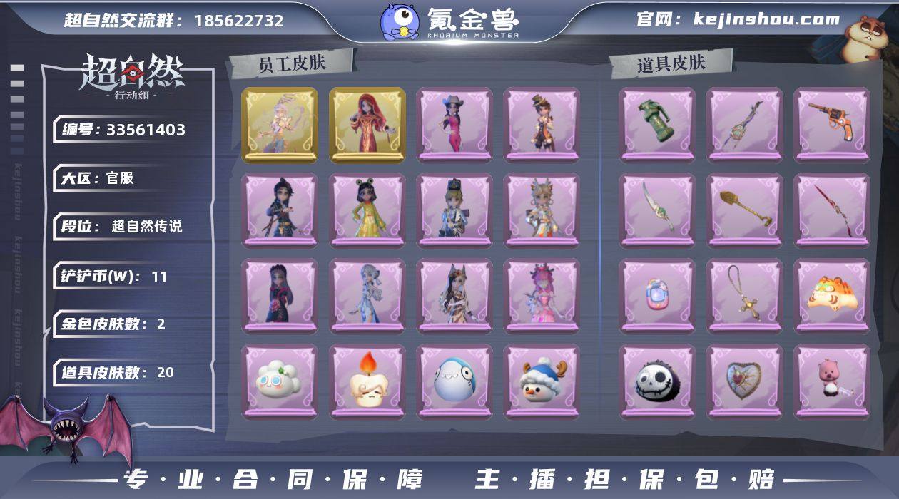 金色皮肤数量: 2 紫色皮肤数量: 10 道具皮肤数量: 20 段位: 超自然传说 外观: 镜花辞,王子与骑士,灵昭鹿鸣,丝缕哀歌,素影瑶光,白光莹,情公主,呆滞头套,炙热烧烤,卑微头套,哈士奇头套,滑稽头套,鱼头怪头套,面具马头套,萨卡班甲鱼头套,蝶恋花,未竟乐园,钗头凤,呱呱雨衣,绣春逍影,九色祥鹿,火爆了头套,莲华渡,精致露比头套,糖果守卫,暗夜小恶魔,雪墩墩头套,太空鲨头套,尘封旧事,耀眼的你,庆宴绮愿,晚安小熊,烛光纪念,醉花阴,不朽的今夜,牛啤背包,饺饺者头套,孤独对望