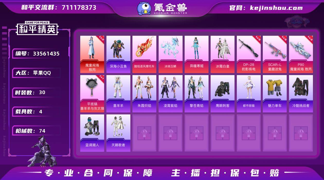【kyhp2023】苹果 手Q-1神装-2粉装-5特效枪-4载具-3粉色飞行器-24709热力值-4王牌印记-30套装-74枪皮 【红色神装等级】:魔童闹海-敖丙(二级) 【红色角色神装】:魔童闹海-敖丙 【热门品类】:套装-深海小丑鱼 【粉色套装】:粉装-冰霜白皇,角色-异瞳寒姬 【粉色枪皮等级】:SCAR-L-童趣迷兔(五级),UMP45-萌骑冒险(四级),P90-魔童闹海 敖丙(三级),DP-28-豹影疾电(五级),平底锅-喜羊羊与灰太狼(一级) 【粉色载具】:纱华曳影,踏焰逐风摩托车,冰绡玉鳞,霜月冰狼 【粉色枪皮】:SCAR-L-童趣迷兔,UMP45-萌骑冒险,P90-魔童闹海 敖丙,DP-28-豹影疾电,平底锅-喜羊羊与灰太狼 【粉色飞行器】:灵珠游龙飞行器,冰狼掠影飞行器 【粉色降落伞】:千金淑猫降落伞,喜羊羊与灰太狼降落伞,魔童闹海 敖丙降落伞,炫彩糖果降落伞,霜月狼主降落伞,鸢尾珑雾降落伞 【稀有套装】:套装-迅捷龙虾,套装-遗迹猎人,角色-都市丽猫,套装-朱霞炽焰,套装-凌霄紫焰,套装-擎苍青焰,玩偶服-喜羊羊,套装-雨过天青,套装-红釉青花,角色-枫露凝珀,角色-皓月伶影 【稀有枪皮】:AKM-灵猫魔法师,M16A4-千金淑猫,SCAR-L-未来战士,GROZA-影袭,Famas-霜月狼主,ARX-凌霄紫焰,UZI-影袭...