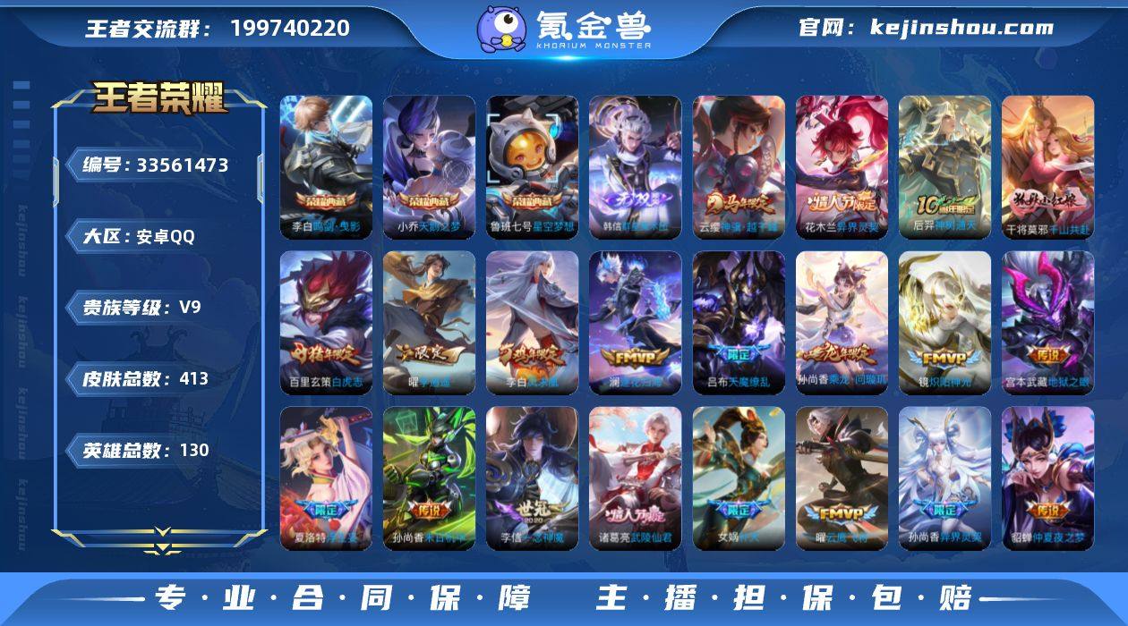 差14924到V10--安卓Q-V9-永恒钻石II段位-130英雄-413皮肤-3典藏皮肤-1典藏英雄-1无双-33传说-117史诗 【英雄全皮】:孙权全皮,橘右京全皮,鬼谷子全皮,狂铁全皮,敖隐全皮,蒙恬全皮,夏洛特全皮,空空儿全皮 【荣耀典藏】:武则天英雄,小乔天鹅之梦,鲁班七号星空梦想,李白鸣剑曳影 【无双皮肤】:韩信群星魔术团 【传说皮肤】:云缨神骥越千峰,花木兰异界灵契,后羿神树通天,干将莫邪千山共赴,孙尚香乘龙问璇玑,澜逐花归海,上官婉儿妄想奇谈,夏洛特浮生妄,干将莫邪画中仙,花木兰燃星之曲,孙悟空齐天大圣,李白诗剑行,橘右京枫霜尽,露娜启示之音,女娲补天,孙尚香异界灵契,曜李逍遥 ,镜炽阳神光,虞姬启明星使,曜云鹰飞将,李信一念神魔,刘备时之恋人,干将莫邪久胜战神,百里玄策白虎志,后羿黄金射手座,诸葛亮武陵仙君,貂蝉仲夏夜之梦,李白凤求凰,孙尚香末日机甲,宫本武藏地狱之眼,孙悟空地狱火,吕布天魔缭乱,狄仁杰超时空战士 【限定皮肤】:姜子牙天穹之誓,狄仁杰阴阳师,赵云皇家上将,墨子神迹守卫,孙尚香异界灵契,庄周云端筑梦师,庄周高山流水,高渐离死亡摇滚,钟无艳超时空战士,白起夜都怪侠,芈月重明,芈月幻夜卜梦,吕布天魔缭...
