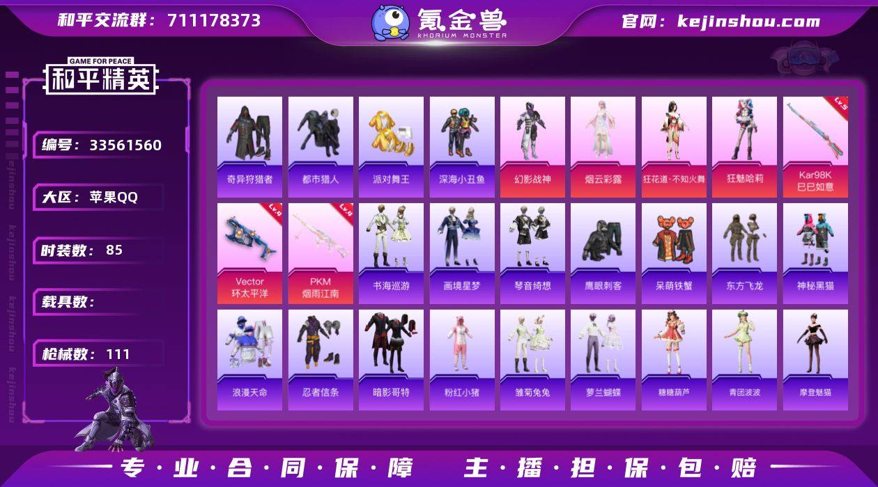 苹果 手Q-5粉装-7特效枪-0载具-0粉色飞行器-32567热力值-1王牌印记-85套装-111枪皮 【热门品类】:套装-浪漫天命,套装-都市猎人,套装-派对舞王,套装-深海小丑鱼,套装-奇异狩猎者,套装-忍者信条,套装-暗影哥特,套装-粉红小猪 【粉色套装】:粉装-幻影战神,角色-烟云彩露,角色-狂花道·不知火舞,角色-狂魅哈莉,角色-虎痴许褚 【粉色枪皮等级】:ACE32-萌骑漫游(四级),UMP45-萌骑冒险(四级),Vector-环太平洋(四级),AKS-74U-森灵之息(四级),Kar98K-巳巳如意(五级),Mk14-福马献瑞(五级),PKM-江南烟雨(四级) 【粉色枪皮】:ACE32-萌骑漫游,UMP45-萌骑冒险,Vector-环太平洋,AKS-74U-森灵之息,Kar98K-巳巳如意,Mk14-福马献瑞,PKM-江南烟雨 【粉色降落伞】:未来战士降落伞,星之彼岸降落伞,环太平洋降落伞,江南烟雨降落伞,精灵梦叶罗丽降落伞,时空协奏降落伞,千金淑猫降落伞,双重狂想降落伞,天马神君降落伞 【稀有套装】:套装-雪国风尚,角色-X,套装-马上有钱,套装-迅捷龙虾,套装-遗迹猎人,套装-雏菊兔兔,套装-萝兰蝴蝶,套装-糖糖葫芦,套装-青团波波,角色-摩登魅猫,套装-燕燕于飞,套装-鱼渊荷华,套装-星影赞美诗,套装-诡诞巡游,套装-混沌...