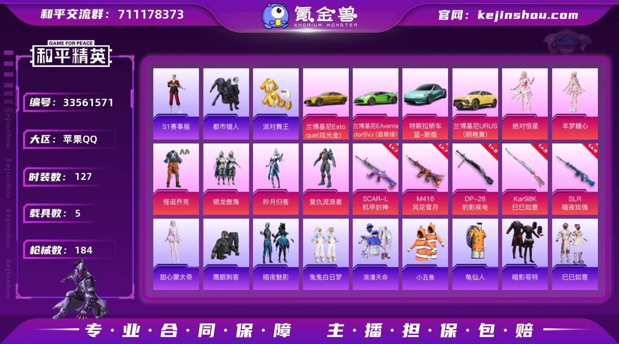 YZJ17098 可二次 身法素材号 地铁满天赋装备还行 小丑 金鞋 都市 S1赛事全套 羊梦糖心 m4风花雪月满级 兔兔白日梦 苹果Q-7稀有4载具6粉装7特效枪15热门127套装184枪皮 65081热力值 10印记 历史卓越王牌8星 【7稀有】 S1赛事 S1赛事裤 S1赛事外套 都市猎人 浪漫天命 派对舞王 派对舞王(金靴子) 【4载具】 兰博轿车金色 兰博SUV黄色 兰博SVJ绿色 特斯拉R水滴蓝 【6粉装】 怪诞乔克 羊梦糖心 绝对恒星 银龙傲海 吟月归客 复仇流浪者 【7特效枪】 Kar98K-巳巳如意 (5级) DP-28-豹影疾电 (5级) SLR-暗夜玫瑰 (4级) M416-风花雪月 (7级) Mk14-福马献瑞 (5级) UMP45-萌骑冒险 (3级) SCAR-L-机甲封神 (7级) 【15热门】 碟中谍A款上衣 小丑鱼 龟仙人 恶魔人蛛 鹰眼刺客 兔兔白日梦 暗影哥特 团圆交子 瑞龙福将 狂沙舞者 漫步者 破蛋小黄鸡 风华少年志 M762-瑞龙福将 M762-风花雪月 【2飞行器】 风花雪月飞行器 焰龙焚天飞行器 【1头盔】 深海小丑鱼头盔 【1背包】 深海小丑鱼背包 营地ID:704403747