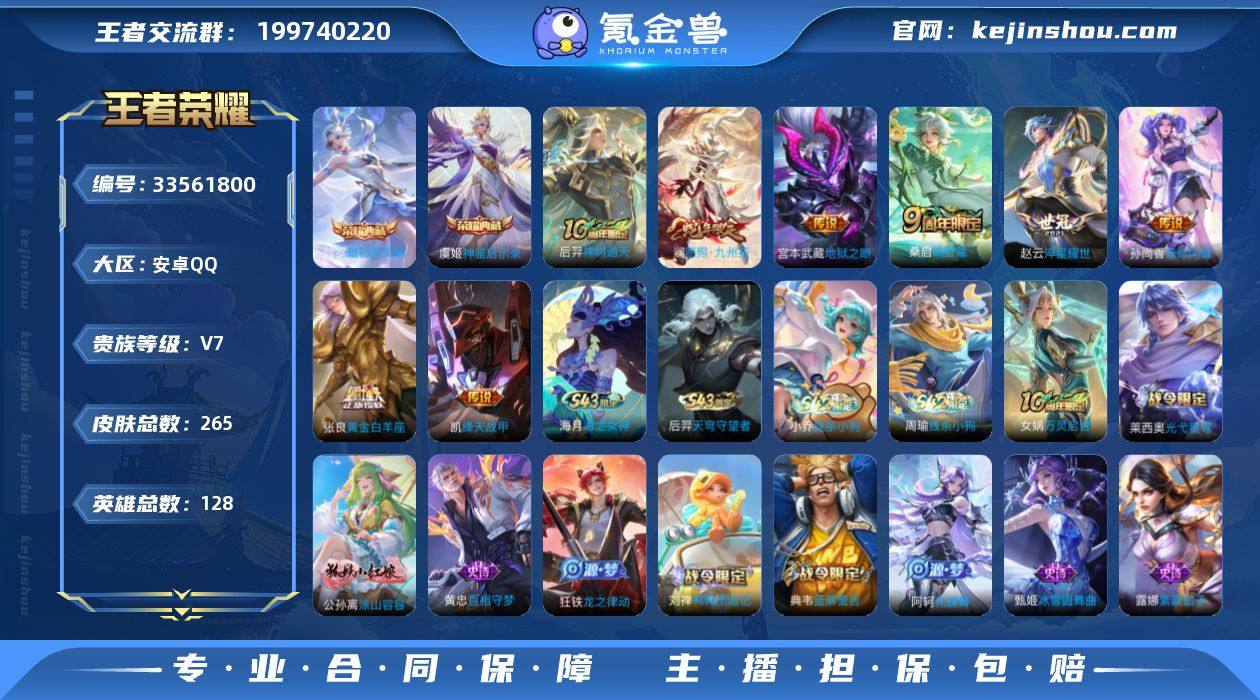 安卓Q-V7-永恒钻石III段位-128英雄-265皮肤-2典藏皮肤-8传说-51史诗 【英雄全皮】:孙权全皮,敖隐全皮,空空儿全皮,影全皮 【荣耀典藏】:虞姬神鉴启示录,伽罗最初的交响 【传说皮肤】:后羿神树通天,澜愿照九州拓,桑启鸣野蒿,孙尚香音你闪耀,赵云淬星耀世,铠绛天战甲,张良黄金白羊座,宫本武藏地狱之眼 【限定皮肤】:白起狰,大乔绒语心约,姜子牙天穹之誓,狄仁杰阴阳师,赵云皇家上将,孙尚香蔷薇恋人,高渐离玩趣恶龙,孙膑妖精王,扁鹊炼金王,芈月重明,元歌无心,夏侯惇朔风刀,曹操烛龙,典韦穷奇,典韦蓝屏警告,狄仁杰魔术师,狄仁杰万华元夜,项羽海滩派对,老夫子醍醐杖,程咬金演武夺筹,兰陵王金庭之子,牛魔御旌,李元芳云中旅人,钟馗驱傩正仪,女娲朔望之晖,蔡文姬繁星吟游,太乙真人饕餮,鬼谷子原初探秘者,鬼谷子五谷丰年,弈星混沌棋,沈梦溪大漠名商,明世隐疑决卦,裴擒虎李小龙,裴擒虎擒涛扼浪,狂铁御狮,米莱狄御霄,盾山御銮,上官婉儿梁祝,鲁班大师探海日志,桑启海盐诗旅,艾琳女武神,艾琳流音漫舞,张良古海寻踪,鬼谷子天穹祈灯,沈梦溪龙舞盛年,鲁班七号蔬乡物语,李元芳蔬乡物语,刘邦剑破天穹,镜青焰无极,项羽苍威无极,...