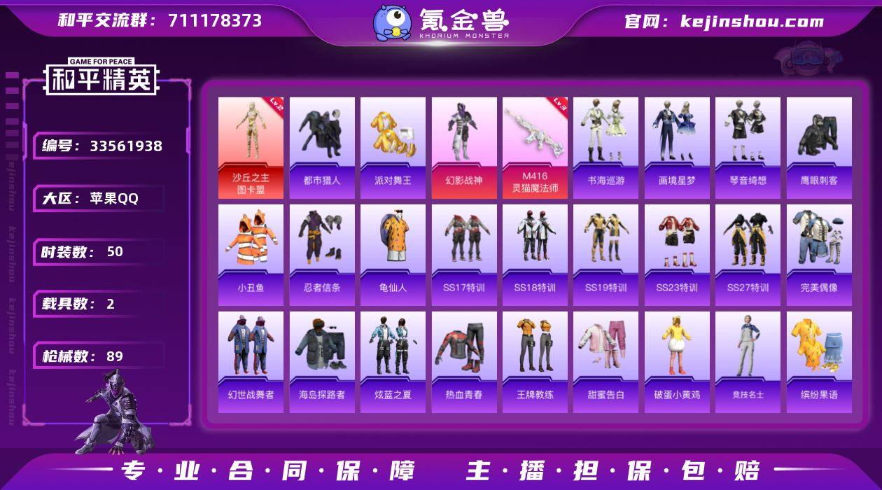 【kyhp2030】苹果 手Q-2神装-1粉装-5特效枪-2载具-6粉色飞行器-29932热力值-2王牌印记-50套装-89枪皮 【红色神装等级】:暮色玫影-艾丽娅(一级),沙丘之主-图卡盟(二级) 【红色角色神装】:暮色玫影-艾丽娅,沙丘之主-图卡盟 【热门品类】:套装-都市猎人,套装-派对舞王,套装-小丑鱼,套装-忍者信条,套装-龟仙人 【粉色套装】:粉装-幻影战神 【粉色枪皮等级】:AKM-暮色玫影(三级),M416-灵猫魔法师(三级),ACE32-萌骑漫游(四级),AKS-74U-森灵之息(五级),Mk14-福马献瑞(五级) 【粉色载具】:暮色幽蹄,九霄玄鹿 【粉色枪皮】:AKM-暮色玫影,M416-灵猫魔法师,ACE32-萌骑漫游,AKS-74U-森灵之息,Mk14-福马献瑞 【粉色飞行器】:香车宝马飞行器,圣域金龙飞行器,终晖之翼飞行器,灵猫魔法师飞行器,暮色之舞飞行器 【粉色降落伞】:幻影战神降落伞,暮色玫影降落伞,鸢尾珑雾降落伞 【稀有套装】:套装-龟仙人,套装-马上有钱,套装-迅捷龙虾,套装-书海巡游,套装-画境星梦,套装-琴音绮想,套装-雨过天青,套装-红釉青花 【稀有枪皮】:AKM-灼热熔岩,AKM-虎虎生威,AKM-灵猫魔法师,M16A4-幻世战舞者,M16A4-快乐主宰,SCAR-L-炫彩节奏,SCAR-L-龙宫之主,M416-红色...