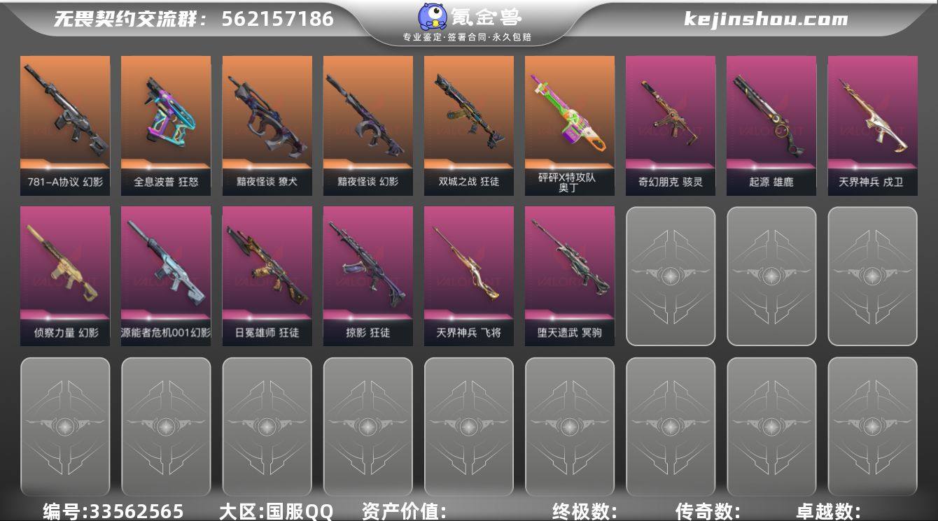 【套装】:VCT 2025 赛季套装,西部未来套装,《双城之战》收藏套装 【英雄】:幻棱,炼狱,维斯,暮蝶,钛狐,壹决,铁臂,捷风,雷兹,幽影,不死鸟,贤者,猎枭,蝰蛇,零,芮娜,奇乐,尚勃勒,霓虹,斯凯,夜露,星礈,K/O,海神,盖可,黑梦,钢锁 【近战武器】:近战武器-VCT 2025 爪刀,近战武器-紫金爪刀,近战武器-澄湖潋滟,近战武器-双城之战 拳套,近战武器-未来开拓者,近战武器-超限闪存 匕首,近战武器-盖亚之愠,近战武器-弧光异彩 军刀,近战武器-荒土机兵 热能刀,近战武器-机动狂飙 战刀,近战武器-诡秘蛇影 军刀,近战武器-神罚//2.0 战锤,近战武器-神圣领域 战刀 【狂徒】:狂徒-归零者,狂徒-双城之战,狂徒-掠影,狂徒-日冕雄师,狂徒-弧光异彩,狂徒-荒土机兵,狂徒-诡秘蛇影 【幻影】:幻影-黯夜怪谈,幻影-西部未来,幻影-781-A协议,幻影-源能者危机001,幻影-侦察力量,幻影-超限闪存,幻影-噬源兽防卫工程,幻影-神圣领域,幻影-纳米打击,幻影-末日之翼,幻影-西部未来 【戍卫】:戍卫-天界神兵,戍卫-彩梦之城,戍卫-浮光跃金,戍卫-逆冲蛮牛,戍卫-月球哨兵,戍卫-折光棱晶 【獠犬】:獠犬-黯夜怪谈,獠犬-弧光异彩,獠犬-神圣领域,獠犬-...