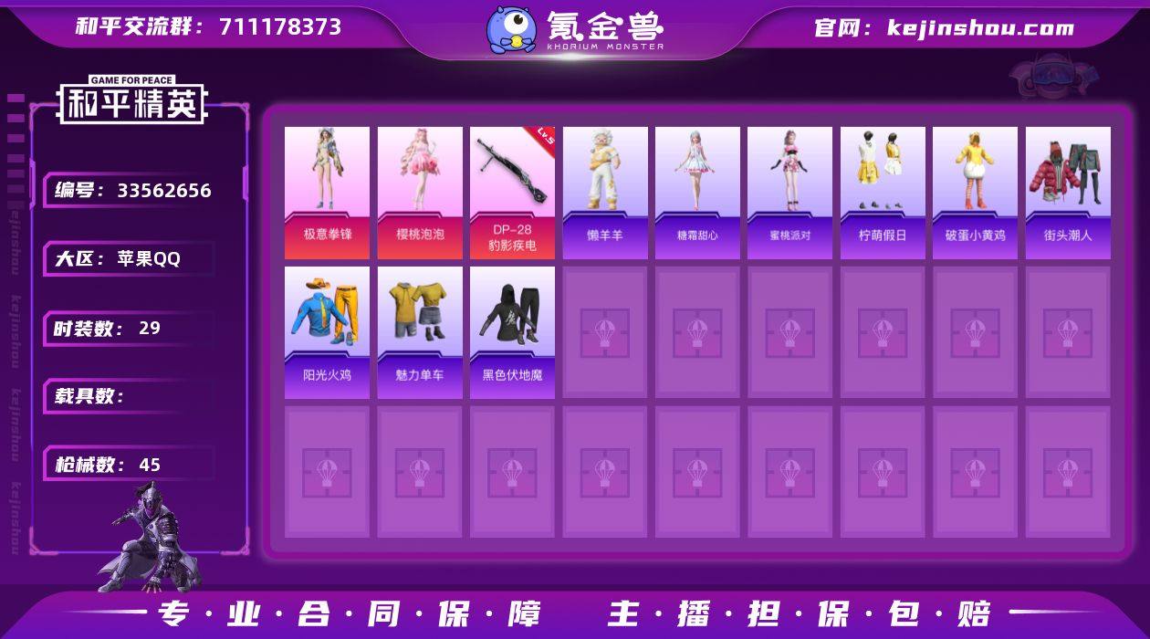 【果q一手妹妹号女号公主号·3粉装3特效枪·樱桃泡泡·极意拳锋】 苹果 手Q-3粉装-3特效枪-0载具-1粉色飞行器-12674热力值-2王牌印记-29套装-45枪皮 【粉色套装】:角色-樱桃泡泡,粉装-极意拳锋,角色-霁蓝缠春 【粉色枪皮等级】:UMP45-萌骑冒险(一级),Mk14-福马献瑞(五级),DP-28-豹影疾电(五级) 【粉色枪皮】:UMP45-萌骑冒险,Mk14-福马献瑞,DP-28-豹影疾电 【粉色飞行器】:炫彩糖果飞行器 【粉色降落伞】:樱桃泡泡降落伞,冷漠罗丽降落伞,异瞳寒姬降落伞,炫彩糖果降落伞,霁蓝缠春降落伞 【稀有套装】:套装-雪国风尚,套装-炫彩糖果,套装-马上来财,角色-糖霜甜心,角色-蜜桃派对,玩偶服-懒羊羊,角色-馥郁金蕊,角色-碧青流霞 【稀有枪皮】:AKM-破晓战魂,M16A4-蓝色火焰,SCAR-L-红色方程式,M416-蓝色火焰,GROZA-荧海星豚,UZI-红色方程式,UMP45-蓝色火焰,汤姆逊-樱桃泡泡,Kar98K-红色方程式,M24-樱桃泡泡,AMR-喜羊羊与灰太狼,MK20-H-樱桃泡泡,S686-红色方程式,S12K-破晓战魂,M249-绯穹魔姬,MG3-幻世战舞者,爆炸猎弓-喜羊羊与灰太狼,大砍刀-咒蚀之裁 【其他套装】:套装-柠萌假日,套装-破蛋小黄鸡,套装-街头潮人,套装-阳光火鸡,套装-魅力单...