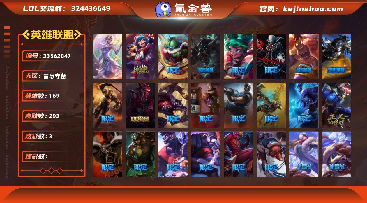 【LOLYH2312】169英雄/293皮肤/1终极/2神话/39限定/3炫彩/19传说/85史诗/未定级/觅心之翼奎因/10周年 安妮/10周年庆典 凤凰/幸福女神 乐芙兰/圣诞开心鬼 提莫/圣诞精灵 崔丝塔娜/“主人不要我了” 阿木木/胡桃夹子 小丑/平安夜女神 娑娜/英勇玩具兵船长/邪恶圣诞老人 维迦/冰雪节 茂凯/雪默丁格/圣诞玩偶 波比/圣诞老人 酒桶/圣诞驯鹿 克格莫/冰雪女神 辛德拉/冰雪兽 纳尔/大元素使/生化领主 泰达米尔/暗黑灵魂 阿利斯塔/诺斯费拉图 弗拉基米尔/冠军典狱长 锤石/S2 暗杀星 蒙多/S2 暗杀星 慎/S3 SKT T1 李青/S4 SSW 图奇/海贼 瑞兹/南瓜头 费德提克/鬼影森森 茂凯/蓝色忧郁 崔斯特/蒙多蒙多/外星装甲 库奇/暗影 沃里克/波比的巧克力工坊/勇者阿狸/都铎王朝 图奇/钢铁之翼 艾尼维亚/红桃杰克 崔斯特/防暴士兵 格雷福斯/防暴士兵 辛吉德/防暴天使 凯尔/警用试作体K-9 内瑟斯/铁哥们儿 奥拉夫/魔幻卡牌 崔斯特/提莫:"约德尔人的一大步"/约德尔国队长 提莫/绅士 科加斯/双重冰晶 艾尼维亚/黯晶凤凰 艾尼维亚/女警狙击 凯特琳/苹果机器人 布里茨/上古战魂 魔腾/地狱行者 孙悟空/银河魔装机神 兰博/第三类接触 黑默丁格/屠龙勇士 潘森/焰尾妖狐 阿狸/苍穹之光 韦鲁斯/宇航员 诺提勒斯/...