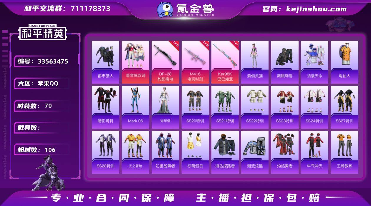 小素材都市+红眼罩无二次苹果 手Q-1粉装-3特效枪-0载具-2粉色飞行器-30559热力值-6王牌印记-70套装-106枪皮XS2641607 【热门品类】:套装-浪漫天命,套装-都市猎人,套装-龟仙人,套装-暗影哥特,角色-Mark.06 【粉色套装】:粉装-星穹咏叹调 【粉色枪皮等级】:M416-电玩时刻(五级),Kar98K-巳巳如意(一级),DP-28-豹影疾电(五级) 【粉色枪皮】:M416-电玩时刻,Kar98K-巳巳如意,DP-28-豹影疾电 【粉色飞行器】:灵猫魔法师飞行器,纱华羽翼飞行器 【粉色降落伞】:百万伏特降落伞,暗夜鎏金降落伞,第五大道降落伞,初号机 觉醒Ver.降落伞,鬼刀降落伞,星穹咏叹调降落伞,灵猫魔法师降落伞,炫彩糖果降落伞,鸢尾珑雾降落伞 【稀有套装】:套装-龟仙人,角色-海琴烟,角色-紫俏灵猫,套装-燕雀桃枝 【稀有枪皮】:AKM-奇异狩猎者,AKM-彩虹符号,AKM-影袭,M16A4-幻世战舞者,M16A4-甜心亚梦,SCAR-L-炫彩节奏,SCAR-L-玉兔迎春,SCAR-L-红色方程式,M416-糯团青竹,M416-红色方程式,GROZA-影袭,GROZA-田园牧歌,AUG-天降萌叽,AUG-耀粉歌者,QBZ-彩虹符号,M762-天降萌叽,Mk47-妙红点点,AC-VAL-天降萌叽,AC-VAL-彩虹甜喵,AC-VAL-甜心亚梦,蜜獾-天降萌叽,蜜獾-娇...