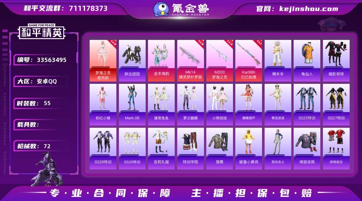 安卓【极品神装号/梦海之灵-妮芮妲(二级)/胖达团团/暗影哥特/蓝螳螂/1神装-1粉装-3特效枪-1粉色飞行器】 手Q--24755热力值-5王牌印记-55套装-72枪皮 【红色神装等级】:梦海之灵-妮芮妲(二级) 【红色角色神装】:梦海之灵-妮芮妲 【热门品类】:套装-胖达团团,套装-龟仙人,套装-暗影哥特,套装-粉红小猪,角色-Mark.06 【粉色套装】:粉装-金丰海韵 【粉色枪皮等级】:Kar98K-巳巳如意(一级),Mk14-精灵梦叶罗丽(五级),M200-梦海之灵(三级) 【粉色枪皮】:Kar98K-巳巳如意,Mk14-精灵梦叶罗丽,M200-梦海之灵 【粉色飞行器】:幻海精灵飞行器 【粉色降落伞】:精灵梦叶罗丽降落伞,创世·救赎降落伞,守护天翼降落伞,金丰海韵降落伞,千金淑猫降落伞 【稀有套装】:套装-龟仙人,套装-雏菊兔兔,套装-萝兰蝴蝶,套装-小熊娃娃,套装-糖糖葫芦,套装-青团波波,玩偶服-懒羊羊 【稀有枪皮】:GROZA-荧海星豚,AUG-天降萌叽,QBZ-彩虹符号,蜜獾-天降萌叽,UZI-天降萌叽,UMP45-生命誓言,Vector-焰鹰斗篷,汤姆逊-炫彩节奏,Kar98K-彩虹符号,AWM-焰鹰斗篷,AMR-喜羊羊与灰太狼,S686-雪月幻音,S686-千金淑猫,S12K-玩趣呆呆,S12K-智耀战神,DBS-焰鹰斗篷,DBS-荧海星豚,D...