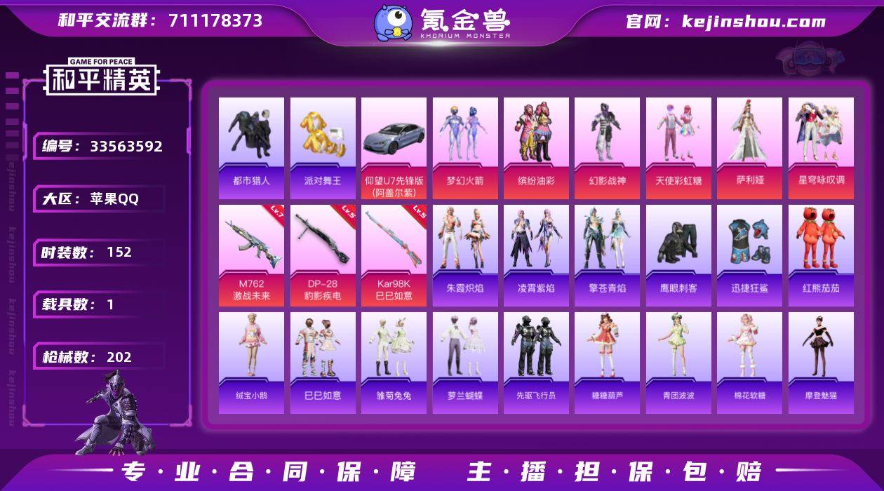 苹果 【素材号 粉装-梦幻火箭/粉装-缤纷油彩/套装-都市猎人/套装-派对舞王/M762-激战未来(七级)/ACE32-萌骑漫游(五级)/仰望U7(阿盖尔紫)】手Q-7粉装-7特效枪-1载具-4粉色飞行器-63956热力值-6王牌印记-152套装-202枪皮 【热门品类】:粉装-梦幻火箭,粉装-缤纷油彩,套装-都市猎人,套装-派对舞王,套装-红熊茄茄 【粉色套装】:粉装-幻影战神,粉装-天使彩虹糖,粉装-梦幻火箭,粉装-缤纷油彩,角色-萨利娅,粉装-星穹咏叹调 【粉色枪皮等级】:M762-激战未来(七级),ACE32-萌骑漫游(五级),UMP45-萌骑冒险(五级),AKS-74U-森灵之息(五级),Kar98K-巳巳如意(五级),Mk14-福马献瑞(五级),DP-28-豹影疾电(五级) 【粉色载具】:仰望U7(阿盖尔紫) 【粉色枪皮】:M762-激战未来,ACE32-萌骑漫游,UMP45-萌骑冒险,AKS-74U-森灵之息,Kar98K-巳巳如意,Mk14-福马献瑞,DP-28-豹影疾电 【粉色飞行器】:香车宝马飞行器,梦幻火箭飞行器,萌物绒绒飞行器,幽焰列车飞行器 【粉色降落伞】:幻影战神降落伞,马卡龙降落伞,阿狸红降落伞,暗夜玫瑰降落伞,恐龙拽拽降落伞,炙焰牛王降落伞,精灵梦叶罗丽降落伞,千金淑猫降落伞,智耀战神降落伞,星穹咏叹调降落伞 【稀有套装】:...