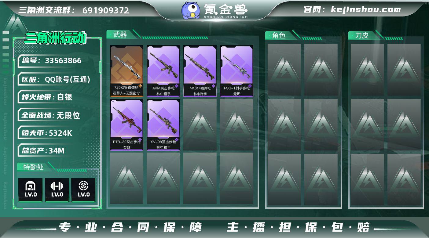 【SJ10052】总资产34M/哈夫币532万/传说枪皮数1/战场等级1/行动等级44/安全箱等时效性道具以游戏内数据为准,详情请看图/近战-黑鹰/725双管霰弹枪-送葬人-无题密令/AKM突击步枪-林中猎手/M1014霰弹枪-林中猎手/PSG-1射手步枪-无垢/SV-98狙击步枪-林中猎手/PTR-32突击步枪-天网/PTR-32突击步枪-英雄/SMG-45冲锋枪-行动开启/SR-3M紧凑突击步枪-雪崩/M1014霰弹枪-幻影结构/M250通用机枪-天网/M4A1突击步枪-高雅黑/AKM突击步枪-彩墨喷涂/K416突击步枪-几何迷彩/K416突击步枪-高雅黑/M16A4突击步枪-山林猎人/SG552突击步枪-海浪/SG552突击步枪-彩墨喷涂/AK-12突击步枪-落花/MP5冲锋枪-海色/UZI冲锋枪-海色/野牛冲锋枪-彩墨喷涂/M1014霰弹枪-海浪/M700狙击步枪-山林猎人/沙漠之鹰-海浪/M1911-坚固材料/阿萨拉狙击兵/阿萨拉霰弹兵/挂饰-彩蛋/挂饰-阿萨拉徽章