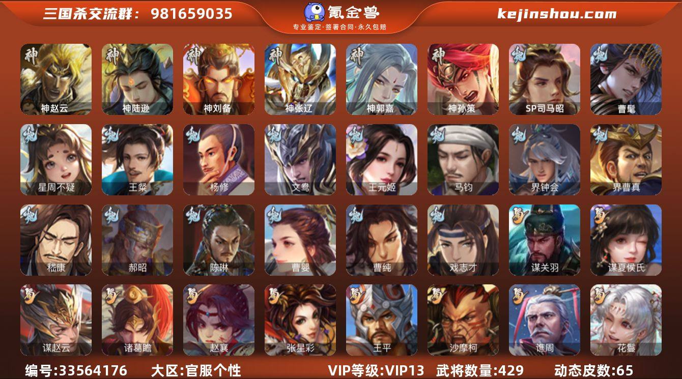 标题:S37281 【支持分期】 VIP等级:VIP13 官阶:大将军 史诗武将数量:66 动态皮肤数量:65 史诗宝珠数量:5 将魂数量:1833 雁翎数量:14252 心愿积分:9989 史诗武将(魏国):文鸯,曹髦,马钧,曹婴,王元姬,界钟会,戏志才,司马昭,势董昭,SP司马昭,星周不疑,界曹真,嵇康,杨修,陈琳,王粲,程昱,曹纯,郝昭 史诗武将(蜀国):谋关羽,谋赵云,谋夏侯氏,沙摩柯,关索,花鬟,谯周,张星彩,王平,诸葛瞻,马云禄,董允,赵襄 史诗武将(吴国):界徐盛,周处,界步练师,界朱然,吴景,贺齐,孙皓,文鸯 史诗武将(群雄):刘焉,十常侍,星董卓,谋貂蝉,界左慈,张琪瑛,许攸,麹义,司马昭,谋张角,郑玄,裴秀,界李儒,星黄忠,界沮授,张让,左慈,兀突骨,沮授,士燮,苏飞,公孙康 史诗武将(神将):神郭嘉,神孙策,神赵云,神陆逊,神张辽,神刘备 其他亮点:欢乐豆27637