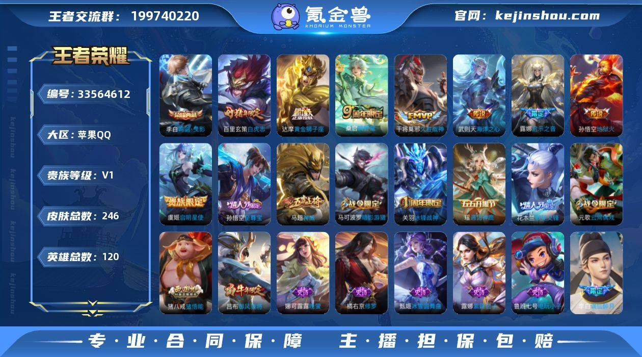 V1 2典藏 8传说 246皮肤 120英雄 【2水晶】李白-鸣剑·曳影【8传说】百里玄策-白虎志,达摩-黄金狮子座,干将莫邪-久胜战神,孙悟空-地狱火,武则天-海洋之心,虞姬-启明星使,露娜-启示之音,桑启-鸣野蒿【64史诗】元歌-无心,鬼谷子-五谷丰年,貂蝉-唤灵魅影,澜-赏金猎手,明世隐-吟游魔法,夏洛特-永昼,阿轲-节奏热浪,安琪拉-心灵骇客,安琪拉-时之奇旅,百里守约-特工魅影,百里玄策-原初追逐者,蔡文姬-繁星吟游,妲己-女仆咖啡,妲己-魅力维加斯,狄仁杰-魔术师,狄仁杰-鹰眼统帅,貂蝉-圣诞恋歌,宫本武藏-鬼剑武藏,关羽-冰锋战神,韩信-逐梦之影,花木兰-水晶猎龙者,花木兰-默契交锋,橘右京-修罗,黄忠-火炮绅士,镜-匿光追影者,铠-曙光守护者,兰陵王-暗隐猎兽者,兰陵王-驯魔猎人,老夫子-航海奇遇记,李白-千年之狐,廉颇-地狱岩魂,刘禅-天才门将,露娜-紫霞仙子,鲁班七号-电玩小子,吕布-圣诞狂欢,吕布-末日机甲,吕布-御风骁将,马超-神威,马可波罗-暗影游猎,蒙犽-狂想玩偶喵,米莱狄-胡桃异想国,墨子-金属风暴,娜可露露-晚萤,牛魔-奔雷神使,上官婉儿-梁祝,裴擒虎-李小龙,孙尚香-水果甜心,孙悟空-至尊宝,王昭君-偶像歌手,夏侯惇-乘风破浪,雅典娜-黎明之约,亚瑟-心灵战警,杨玉环-遇见飞天,瑶-遇见神鹿,...