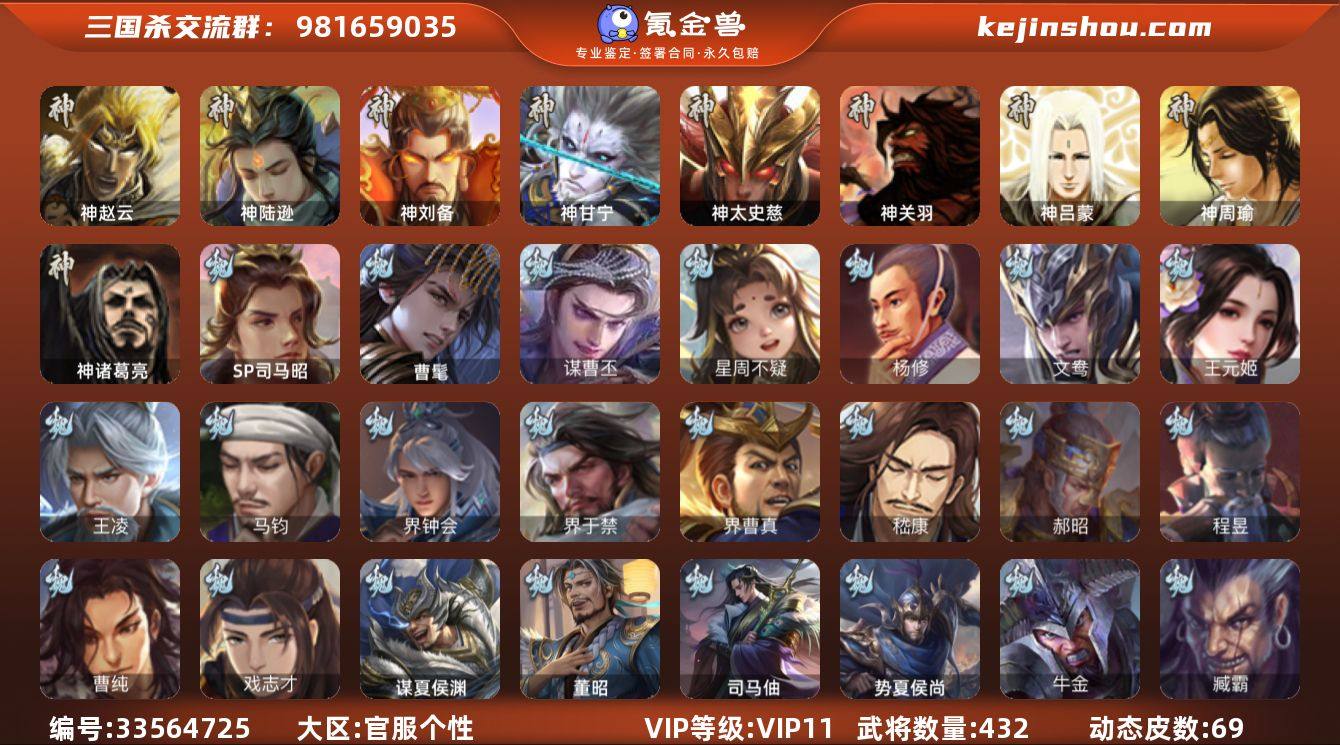 官阶:大将军 VIP等级:VIP11级 史诗武将数:62 动态皮肤数:69 武将总数:432 史诗宝珠数:85 元宝数:1002 将魂数:17800 神赵云,神陆逊,神刘备,神甘宁,神太史慈,神诸葛亮,SP司马昭,曹髦,星周不疑,杨修,王元姬,王凌,马钧,界钟会,界于禁,界曹真,嵇康,郝昭,曹纯,戏志才,谋曹丕,程昱,关索,谋赵云,谋马超,诸葛瞻,赵襄,张星彩,沙摩柯,谯周,界黄忠,花鬘,鲍三娘,周处,吴景,孙寒华,骆统,留赞,界朱然,界徐盛,界步练师,贺齐,文鸯,谋貂蝉,裴秀,左慈,郑玄,张让,杨彪,苏飞,审配,麹义,南华老仙,祢衡,沮授,界左慈,界李儒,公孙康,杜预,许攸,星董卓,兀突骨,司马昭,神吕蒙,神周瑜,神关羽,势夏侯尚,SP关羽,SP蔡文姬,乐进,曹昂,诸葛诞,朱灵,文聘,SP姜维,张春华,钟会,曹冲,郭淮,满宠,界王异,界曹操,界司马懿,界夏侯惇,界张辽,界许褚,界郭嘉,李典,曹真,韩浩史涣,陈群,曹叡,曹休,钟繇,司马朗,王基,李通,郭皇后,孙资刘放,辛宪英,界甄姬,吕虔,鲁芝,蒯越蒯良,界典韦,界荀彧,界徐晃,杜畿,界曹丕,毌丘俭,张恭,界曹植,界满宠,界郭淮,卞夫人,辛毗,界陈群,华歆,蔡贞姬,袁涣,王双,崔琰,毛玠,阮慧,谋徐晃,谋于禁,界曹休,牵招,司马孚,司马伷,谋夏侯渊,牛金,界夏侯渊,臧霸,唐咨,董昭,势庞羲,势陈到,SP孙尚香,关银屏,夏...