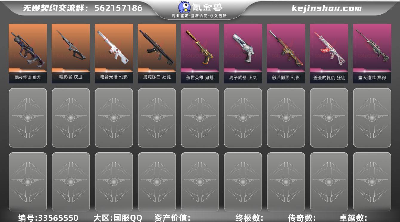 【英雄】:幻棱,炼狱,维斯,暮蝶,钛狐,壹决,铁臂,捷风,雷兹,幽影,不死鸟,贤者,猎枭,蝰蛇,零,芮娜,奇乐,尚勃勒,霓虹,斯凯,夜露,星礈,K/O,海神,盖可,黑梦,钢锁 【近战武器】:近战武器-威龙之刃,近战武器-鬼丸国纲,近战武器-极简主义//2.0 爪刀,近战武器-荒土机兵 热能刀,近战武器-诡秘蛇影 军刀,近战武器-神圣领域 战刀,近战武器-日耀风暴 遗器 【狂徒】:狂徒-混沌序曲,狂徒-塑水宗,狂徒-盖亚的复仇,狂徒-荒土机兵,狂徒-诡秘蛇影 【幻影】:幻影-电音光谱,幻影-般若假面,幻影-神圣领域,幻影-纳米打击,幻影-末日之翼,幻影-电音光谱 【戍卫】:戍卫-噬影者,戍卫-逆冲蛮牛,戍卫-月球哨兵,戍卫-折光棱晶 【獠犬】:獠犬-黯夜怪谈,獠犬-神圣领域,獠犬-逆冲蛮牛 【冥驹】:冥驹-堕天遗武,冥驹-荒土机兵,冥驹-星云暗涌 【飞将】:飞将-末日之翼 【莽侠】:莽侠-诡秘蛇影,莽侠-月球哨兵 【战神】:战神-神圣领域 【奥丁】:奥丁-纳米打击,奥丁-末日之翼 【判官】:判官-诡秘蛇影,判官-纳米打击x 【雄鹿】:雄鹿-逆冲蛮牛,雄鹿-月球哨兵 【骇灵】:骇灵-荒土机兵,骇灵-星云暗涌 【蜂刺】:蜂刺-星云暗涌,蜂刺-折光棱晶 【标配】...