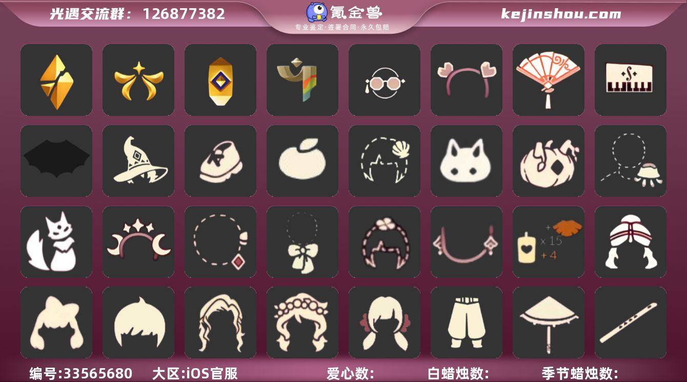 账号类型: 邮箱账号 季节已毕业: 破晓季,欧若拉季,追忆季,彩染季 完成地图: 无 珍稀物品: 透明蝶翼斗 礼包: 蝙蝠套,巫师,运动鞋,橘子,贝壳,兔子,南瓜,水母,猫背饰,星月头饰,彩虹耳钉,蝴蝶结,四叶草,新年耳钉,创始人,献瑞折扇礼包,心心相印发饰礼包,立式钢琴礼包,幸运亨通眼镜礼包 裤子: 武士裤 发型: 蝴蝶结,正太,樱花,公主头,虚荣 头饰: 花环 斗篷: 红金,花瓣斗篷 配饰: 雨伞,高音钢琴,吉他,笛子