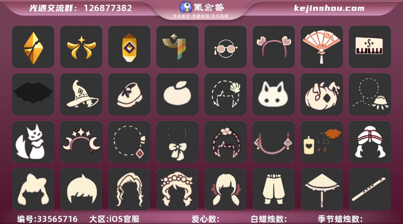 账号类型: 邮箱账号 季节已毕业: 破晓季,欧若拉季,追忆季,彩染季 完成地图: 无 珍稀物品: 透明蝶翼斗 礼包: 蝙蝠套,巫师,运动鞋,橘子,贝壳,兔子,南瓜,水母,猫背饰,星月头饰,彩虹耳钉,蝴蝶结,四叶草,新年耳钉,创始人,献瑞折扇礼包,心心相印发饰礼包,立式钢琴礼包,幸运亨通眼镜礼包 裤子: 武士裤 发型: 蝴蝶结,正太,樱花,公主头,虚荣 头饰: 花环 斗篷: 红金,花瓣斗篷 配饰: 雨伞,高音钢琴,吉他,笛子
