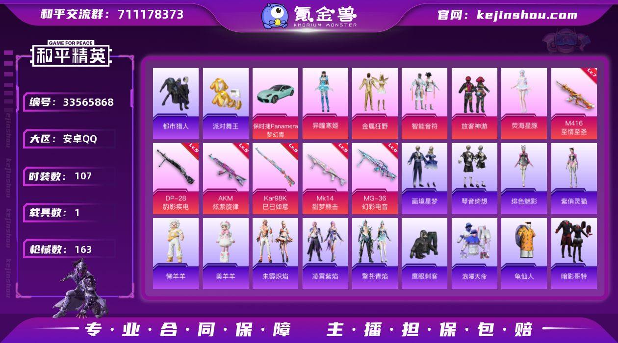 安卓【小号/M416-至情至圣(七级)/放客神游/派对舞王/都市猎人/暗影哥特/5粉装-9特效枪-1载具-2粉色飞行器】 手Q--47554热力值-5王牌印记-107套装-163枪皮 【热门品类】:套装-浪漫天命,套装-都市猎人,套装-派对舞王,套装-龟仙人,套装-暗影哥特,熔岩游骑兵连帽夹克 【粉色套装】:粉装-金属狂野,粉装-智能音符,粉装-放客神游,角色-荧海星豚,角色-异瞳寒姬 【粉色枪皮等级】:AKM-炫紫旋律(五级),M416-至情至圣(七级),AKS-74U-森灵之息(四级),Kar98K-巳巳如意(五级),Mk14-甜梦熊击(五级),Mk14-福马献瑞(五级),AA12-G-萌骑幻想(四级),DP-28-豹影疾电(五级),MG-36-幻彩电音(四级) 【粉色载具】:保时捷Panamera(梦幻青) 【粉色枪皮】:AKM-炫紫旋律,M416-至情至圣,AKS-74U-森灵之息,Kar98K-巳巳如意,Mk14-甜梦熊击,Mk14-福马献瑞,AA12-G-萌骑幻想,DP-28-豹影疾电,MG-36-幻彩电音 【粉色飞行器】:炫彩糖果飞行器,极意拳锋飞行器 【粉色降落伞】:月影灵韵降落伞,桃粉嫣然降落伞,幻彩电音降落伞,无垠阁降落伞,异瞳寒姬降落伞,炫彩糖果降落伞,暮色玫影降落伞 【稀有套装】:套装-龟仙人,套装-巳巳如意,套装-雪国风尚,套装-炫彩糖果,套装-马上...