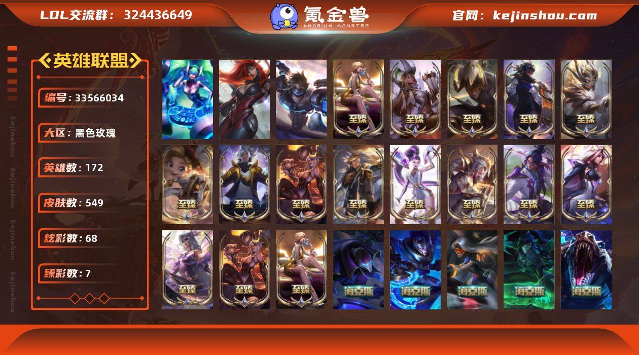 黄金段位-172英雄-549皮肤-68炫彩-3终极-25神话-66限定-53传说-137史诗 【热门头像】:勇者阿狸头像 【神话皮肤】:十周年纪念安妮,源代码乐芙兰,暗星科加斯,灰烬骑士莫德凯撒 【至臻皮肤】:至臻灵魂莲华易,至臻魅惑女巫厄运小姐,至臻绝息圣堂厄运小姐,至臻KDA伊芙琳,至臻KDA伊芙琳(2022),至臻花仙使者卡特琳娜,至臻黑夜使者李青,至臻烈焰美人薇恩,至臻烈焰美人薇恩(2022),至臻灵能特工伊泽瑞尔,至臻女帝黛安娜,至臻奥术师佐伊,至臻魔女婕拉,至臻KDAALLOUT卡莎,至臻真实伤害亚索,至臻真实伤害赛娜 【海克斯皮肤】:新创战纪希维尔,海克斯科技魔腾,海克斯科技雷克顿,海克斯科技嘉文四世,摄魂使者薇恩 【臻彩皮肤】:天龙之子卡莎飞龙乘云,墨之影武者亚索金墨耀影,冠军之刃锐雯2016凯旋圣装,星之吞噬者莫甘娜热情之末,魔女阿卡丽虚荣,净雪之月莫甘娜冬虹,心之钢伊泽瑞尔天纵才华 【年限皮肤】:你看见过我的熊猫吗安妮,美猴王孙悟空,紫金罗刹莫甘娜,玉净夜叉凯特琳,北辰之威内瑟斯,春晖神女拉克丝,福牛守护者阿利斯塔 【情人节限定】:甜心宝贝安妮 【冰雪限定】:圣诞狂欢基兰,阿木木“主人不要我了”,平安夜女神娑娜,邪恶圣诞老人维迦,...