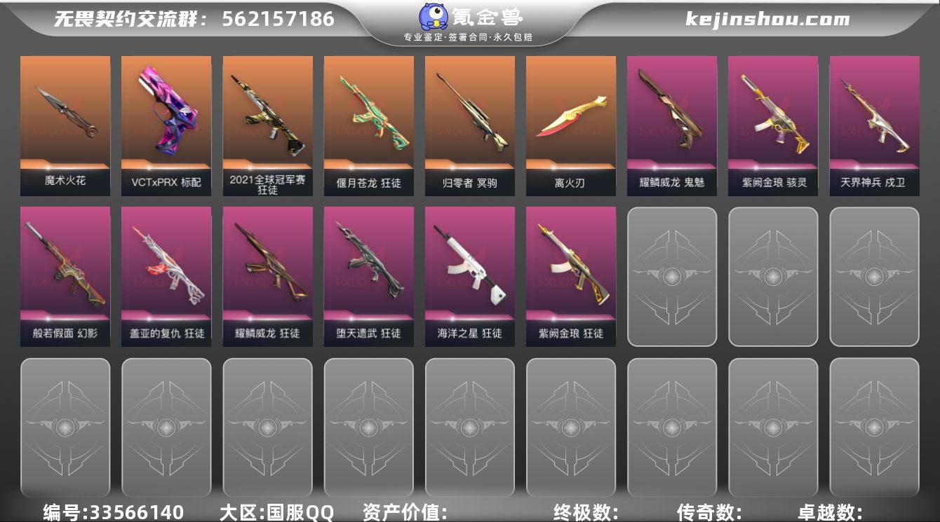 【套装】:2021全球冠军赛套装,无畏契约季前邀请赛套装,西部未来套装,离火刃套装,耀鳞威龙套装,无畏启程套装,离火刃套装 【英雄】:幻棱,炼狱,维斯,暮蝶,钛狐,壹决,铁臂,捷风,雷兹,幽影,不死鸟,贤者,猎枭,蝰蛇,零,芮娜,奇乐,尚勃勒,霓虹,斯凯,夜露,星礈,K/O,海神,盖可,黑梦,钢锁 【近战武器】:近战武器-2021全球冠军赛 爪刀,近战武器-无畏契约季前邀请赛 悲悯之刃,近战武器-魔术火花,近战武器-紫金爪刀,近战武器-离火刃,近战武器-威龙之刃,近战武器-未来开拓者,近战武器-珍珠棘贝 短剑,近战武器-超能偶像 应援棒,近战武器-盖亚之怒,近战武器-钢轨卫士 战锤,近战武器-弧光异彩 军刀,近战武器-沙尘幻旅 匕首,近战武器-神圣领域 战刀,近战武器-魔术火花 【狂徒】:狂徒-2021全球冠军赛,狂徒-归零者,狂徒-偃月苍龙,狂徒-RGX 11z Pro,狂徒-堕天遗武,狂徒-盖亚的复仇,狂徒-海洋之星,狂徒-耀鳞威龙,狂徒-紫阙金琅,狂徒-奇幻朋克//3.0,狂徒-超能偶像,狂徒-钢轨卫士,狂徒-弧光异彩,狂徒-沙尘幻旅 【幻影】:幻影-西部未来,幻影-般若假面,幻影-奇幻朋克//3.0,幻影-噬源兽防卫工程,幻影-珍珠棘贝,幻影-神圣领域,幻影-...