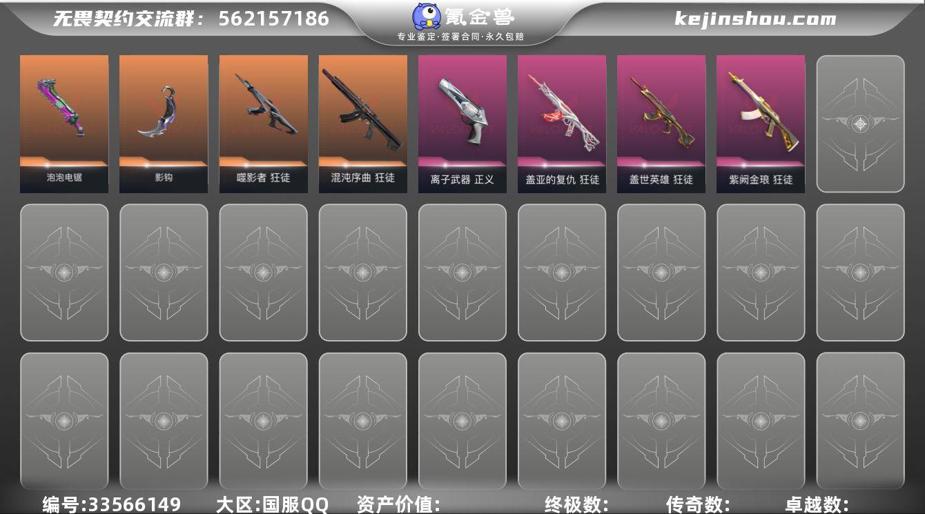 【英雄】:幻棱,炼狱,维斯,暮蝶,钛狐,壹决,铁臂,捷风,雷兹,幽影,不死鸟,贤者,猎枭,蝰蛇,零,芮娜,奇乐,尚勃勒,霓虹,斯凯,夜露,星礈,K/O,海神,盖可,黑梦,钢锁 【近战武器】:近战武器-泡泡电锯,近战武器-影钩,近战武器-5周年//公测重制版 苍龙之刃,近战武器-夜之蝴蝶,近战武器-机动狂飙 战刀,近战武器-日耀风暴 遗器,近战武器-阿特拉斯指挥部 甩棍,近战武器-星际猎兵 短剑 【狂徒】:狂徒-混沌序曲,狂徒-噬影者,狂徒-多弥尔的复仇,狂徒-盖世英雄,狂徒-盖亚的复仇,狂徒-紫阙金琅 【幻影】:幻影-混沌序曲//2.0 【獠犬】:獠犬-混沌序曲//2.0 【骇灵】:骇灵-无限竞技 【正义】:正义-离子武器 【狂怒】:狂怒-蒙太奇 【卡面】:正义的化身 卡面,树懒大作战 卡面,红鳞松叶 卡面,Clutch 卡面,无畏契约GO!第一卷:芮娜 卡面,无畏契约GO!第一卷:零 卡面,《双城之战》金克丝 卡面,代号红色 卡面,新兵报到 卡面,V契约 卡面,无畏契约 卡面 【喷漆】:像素星礈 喷漆,又被闪了 喷漆,战术熊的巴拉莱卡琴 喷漆,霓光四射 喷漆,买装还是存钱 喷漆,关门放狗 喷漆,无畏契约GO!第一卷:零 喷漆,无畏契约GO!第一卷:贤者 喷漆,放下...