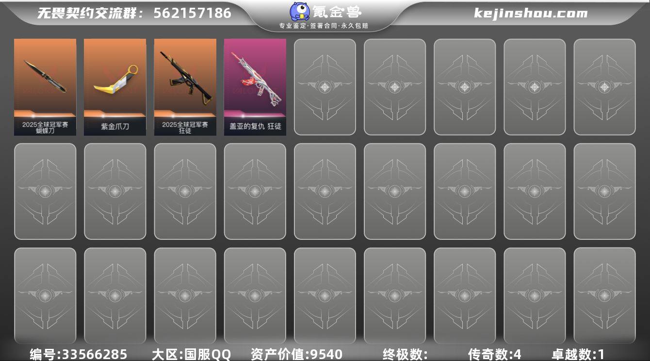 段位: 白银 近战武器皮肤: 紫金爪刀-紫阙金琅//2.0,2025全球冠军赛 蝴蝶刀 步枪皮肤: 狂徒-盖亚的复仇,2025全球冠军赛 狂徒 亮点: 【充值总皮肤】: 2025全球冠军赛 狂徒, 2025全球冠军赛 蝴蝶刀, 盖亚的复仇 狂徒, 紫金爪刀