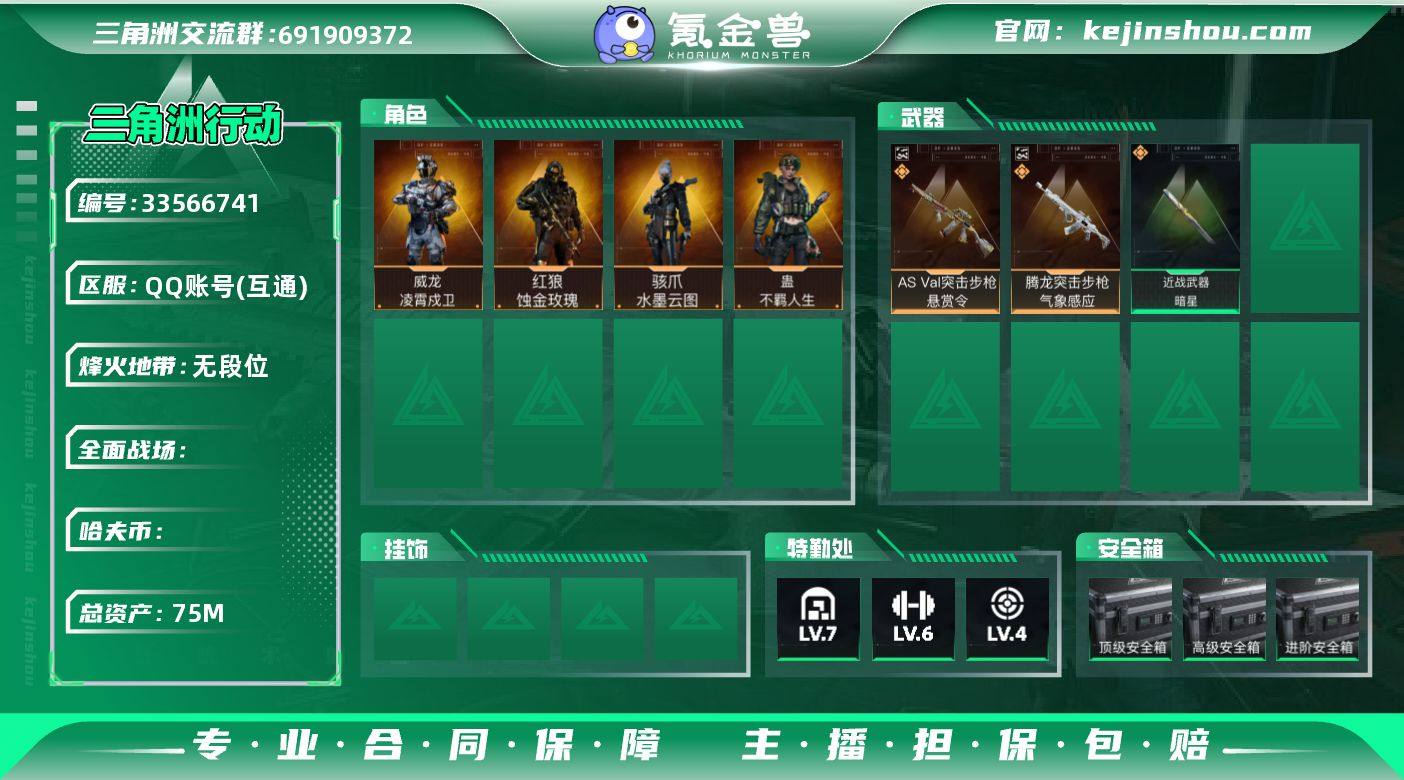 75m总资产【干员外观】:红狼蚀金玫瑰,威龙凌霄戍卫,蛊-不羁人生,骇爪水墨云图【近战皮肤】:暗星【典藏2件】:ASVal悬赏令,腾龙气象感应