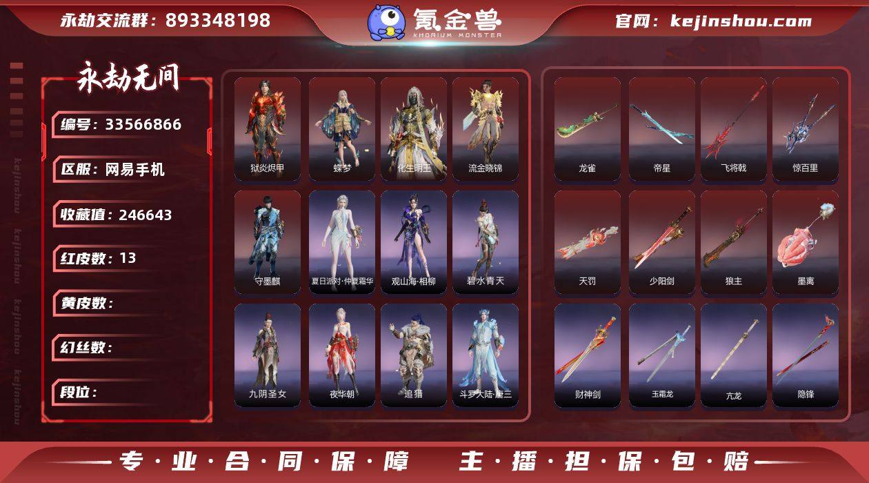 YJJ2346/5.11换绑/等级276/s20三人黄金3/13红318金收藏值246643/化生明王/狱炎烬甲/蝶梦/流金晓锦/守墨麒/少阳剑/帝星/狼主/龙雀/飞将戟/惊百里/天罚/墨离/【技能奥义】/荆魂/赤莲/揽九天 宁红夜:/相柳/九阴圣女/夜华朝/碧水青天/簪缨发 沈妙:/涂鸦少女/奥村春NOIR/NOIR发型 天海:/化生明王/少林/白熊 殷紫萍:/萍之缘/鹅黄纱梦/长夏清澜/瑶光沐月/暖绒发 特木尔:/致命玩笑/唐三/多闻天王/追猎/海神发 季沧海:/狱炎烬甲/鹧鸪天/康复之星/信手斩龙/游四海/江海沧澜/腾烟发/江海发/烈火发 胡桃:/蝶梦/星空投影/小可/遣唐使/清雅少女/贵胄少女/月丹发/洛天依投影发 妖刀姬:/暗夜利刃/赤影妖刀姬 崔三娘:/敖丙/文鳐 岳山:/弘毅袍/铁面/破荆者/玄鳞发 无尘:/玉衡天君/申公豹/清威发 顾清寒:/龙吉公主/仲夏霜华/红鸾星发 武田信中:/祸津素盏 迦南:/夜吻/瀚海苍鹰 胡为:/蛤蟆头领 季莹莹:/炽火照夜/盛夏白阳/哪吒/雾灼发 玉玲珑:/妲己/幽夜玲珑/春不敛/笼烟芍药发/惊雀发/迷心发 哈迪:/卷王/夜绸袍 魏轻:/钟鼎光/寿竹云春/玄影/念奴娇/极夜天曦/极夜发/豪杰发 刘炼:/流金晓锦/金财聚辉/姜子牙/仙风发 张起灵:/守墨麒/古冢行/越野帽衫/鹤姿发 席拉:/天虹咏/暧冬茶馨 蓝梦:/如梦令/沉醉...