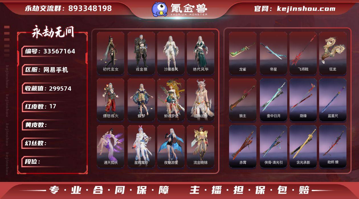 YJJ2348/5.11换绑/等级369/s20三人坠日2/19红409金收藏值299574/初代玄女/星辉魔纱/戎金狼/熛怒炼火/蝶梦/蛉魂梦使/泣珠龙纱/绝代风华/沙漠香风/夜魅游莹/通天狐袄/流金晓锦/寒梅傲雪/帝星/狼主/龙雀/飞将戟/狂龙/龙骧/【技能奥义】/荆魂/揽九天/神君印 宁红夜:/初代玄女/昆仑之主/蜘蛛精/耀世魂花/夜华朝/碧水青天/玄豹姿/九阴圣女/簪缨发 沈妙:/星辉魔纱/绮云衫/絮云衣/百灵发/韶光发 天海:/少林/白熊/禅法/觉明尊者/若水尊者/八宝龙王/缘觉发 殷紫萍:/萍之缘/瑶光沐月/沐昭/紫芙发/伏苓发/苏木发 特木尔:/戎金狼/唐三/致命玩笑/多闻天王/苍狼之主/追猎/苍狼宗主发/海神发 季沧海:/熛怒炼火/龙心炽焰/街头烈火/醉山川/游四海/江海沧澜/江海发 胡桃:/蝶梦/阴阳姬/御宅罗梦/清雅少女/樱舞发/月下香发/月丹发 妖刀姬:/蛉魂梦使/赤影妖刀姬 崔三娘:/泣珠龙纱/巨鲸客/精卫/镇海龙/安澜发/鲸海发 岳山:/弘毅袍/常胜袍/过江龙/万仞山发 无尘:/司天命/灵鹿巫者/幽篁山鬼/竹律发 顾清寒:/藏雨阁主/金襦玉衫/春霁发 武田信中:/狮子丸/祸津素盏/麟鹿大铠/忠嘉发 迦南:/绝代风华/沙漠香风/神鹰之女/观山海青鸟/瀚海苍鹰/翔鸾发/夕鹰发/青鸾发 胡为:/行空裘/秋神蓐收/天刑发 季莹莹:/夜魅...