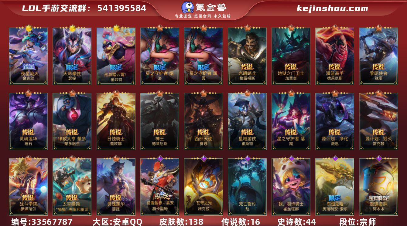 实名: 可修改 段位: 宗师 皮肤数: 138 神话皮: 巡游踏云霄!墨菲特,天命豪侠 瑟提,夜星流火 金克丝 限定皮肤: 星之守护者霞,星之守护者洛 传说皮: 地狱之门卫士,灌篮高手,黎明使者锐雯,律政大亨,日蚀骑士蕾欧娜,神王诺手,西部天使赛娜,星域游侠卡牌,星之守护者 落,源计划:净化,战斗学院ez,灵魂莲华锤石,源计划:泯灭,光明哨兵格雷福斯,太空律动机器人,灵魂莲华腕豪 亮点: 【优质装备】:灌篮高手,黎明使者锐雯,律政大亨,日蚀骑士蕾欧娜,神王诺手,西部天使赛娜,星域游侠卡牌,星之守护者 落,源计划:净化,战斗学院ez,灵魂莲华锤石,源计划:泯灭,光明哨兵格雷福斯,灵魂莲华腕豪