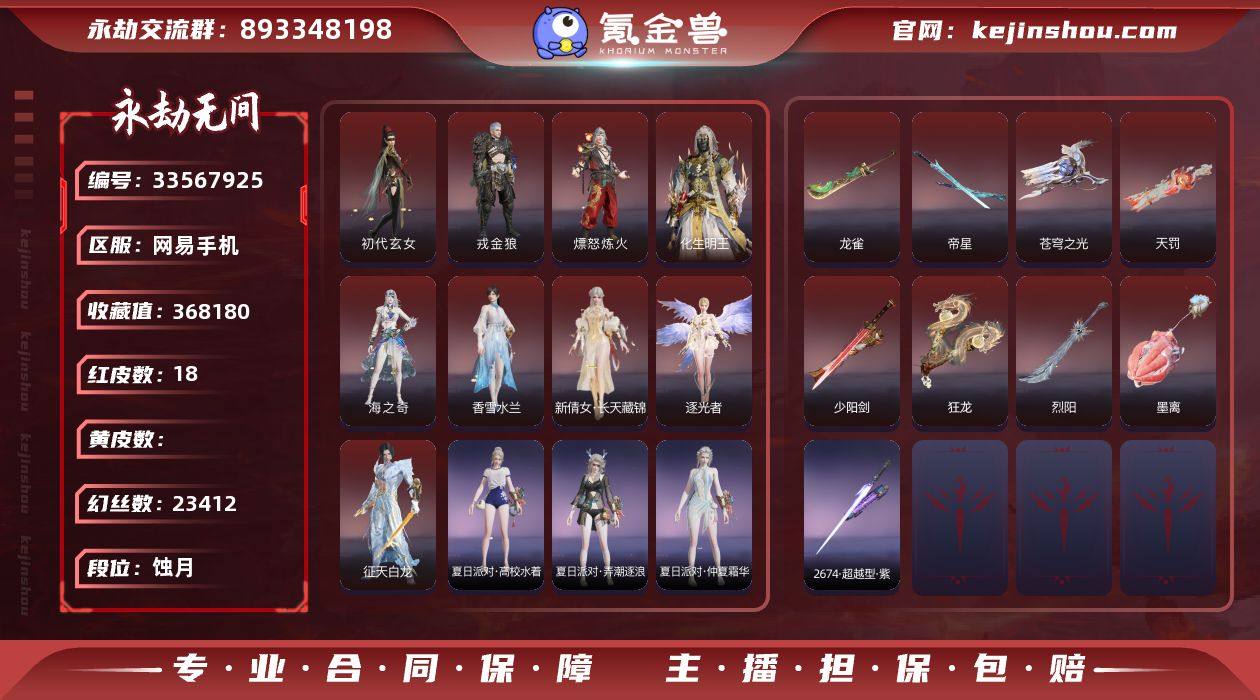 WJ6154,网易手机,5月19可换绑,三人段位蚀月3,1谪星,18红,665金,声望3,谪星信手斩龙,2孔,1黄,1蓝,等级508,收藏值368180,幻丝23412,通行证Lv4,变身器,荆魂,西行劫神君印,雪霜姿,拳皇勾玉,千秋匠心凶虎,揽九天,,雷云敕雨令,守望先锋D.Va战斗机甲,御祥云,炎烈珠,红色神品,墨离,香雪水兰,逐光者,征天白龙,化生明王,新倩女幽魂长天藏锦,戎金狼,初代玄女,熛怒炼火,海之奇,天罚,苍穹之光,帝星,龙雀,烈阳,狂龙,少阳剑,2674超越型紫,角色金色皮肤,P5R雨宫莲JOKER,黄庭道,封神录申公豹,金羽客,玉漱冰骢,墨染千秋剪春漪,禄运玉霄,金襦玉衫,夏日派对仲夏霜华,赤丹朱湛,寒英素雪,麟鹿大铠,花之倾奇,苍雷丸,共赴无间赤焰舞影,倒反阴阳凛冬,巅峰极速蕾雅,神鹰之女,火罗圣女,惊云羽,浣烟纱,蜃楼魅影,璨银魔枭,逆水寒夜行,福瑞天泽,冬无归,怦然心动音律织光,秋藏桂,P5R奥村春NOIR,绿野守护悠竹萌客,楚韵九歌山鬼,街头狂欢涂鸦少女,共赴无间幽夜玲珑,春不敛,赤阳天狐,塔罗序衔环,卷王,长歌诗韵念奴娇,寿竹云春,夏日派对半夏晚风,湛卢,正法袍,赤诚心,云间影,夏日派对逐浪砂阳,赤焰战灵,绿野守护山...