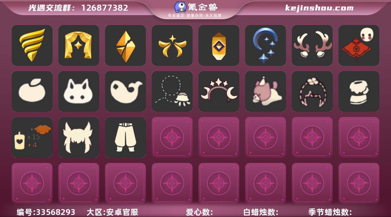 账号类型: 手机账号 季节已毕业: 潜海季,表演季,破晓季,欧若拉季,夜行季,追忆季 完成地图: 晨岛,雨林,霞谷,暮土 珍稀物品: 白枭,透明蝶翼斗 礼包: 鹿角,福娃,橘子,兔子,鲤鱼,水母,星月头饰,奥利奥,四叶草,雪人鞋,创始人 裤子: 武士裤 发型: 白枭