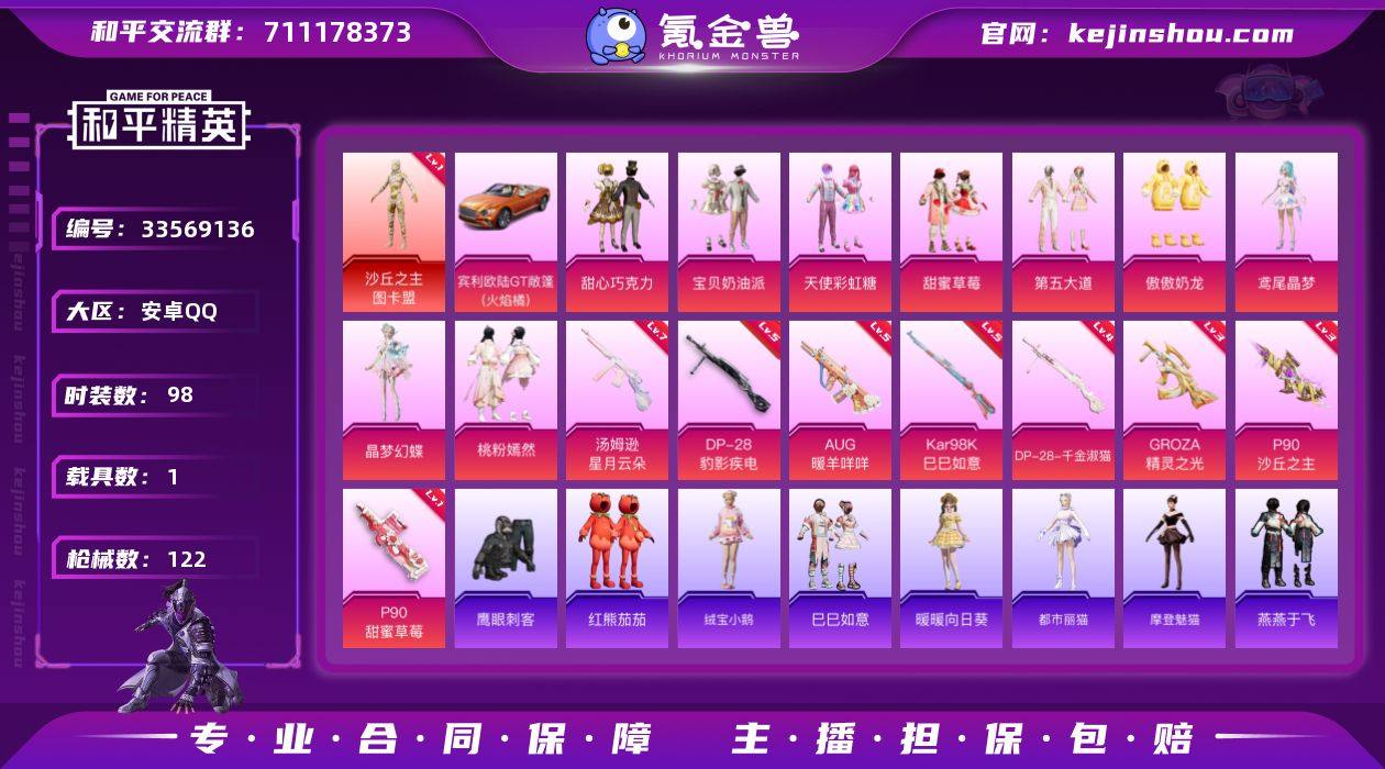 安卓 手Q-1神装-9粉装-10特效枪-1载具-9粉色飞行器-44146热力值-7王牌印记-98套装-122枪皮 【红色神装等级】:沙丘之主-图卡盟(一级) 【红色角色神装】:沙丘之主-图卡盟 【热门品类】:套装-红熊茄茄 【粉色套装】:粉装-甜心巧克力,粉装-宝贝奶油派,粉装-天使彩虹糖,粉装-甜蜜草莓,粉装-第五大道,粉装-傲傲奶龙,角色-鸢尾晶梦,角色-晶梦幻蝶,粉装-桃粉嫣然 【粉色枪皮等级】:GROZA-精灵之光(三级),AUG-暖羊咩咩(五级),UMP45-萌骑冒险(四级),汤姆逊-星月云朵(七级),P90-甜蜜草莓(一级),P90-沙丘之主(三级),Kar98K-巳巳如意(五级),Mk14-福马献瑞(一级),DP-28-千金淑猫(四级),DP-28-豹影疾电(五级) 【粉色载具】:宾利欧陆GT敞篷(火焰橘) 【粉色枪皮】:GROZA-精灵之光,AUG-暖羊咩咩,UMP45-萌骑冒险,汤姆逊-星月云朵,P90-甜蜜草莓,P90-沙丘之主,Kar98K-巳巳如意,Mk14-福马献瑞,DP-28-千金淑猫,DP-28-豹影疾电 【粉色飞行器】:酣梦熊熊飞行器,香车宝马飞行器,炫彩糖果飞行器,沙丘之主天马,幻海精灵飞行器,曦光华影飞行器,圣域金龙飞行器 【粉色降落伞】:绝对恒星降落伞,甜心宝贝降落伞,鸢尾晶梦降落伞,千金淑猫降落伞,鬼刀降落伞,晶...