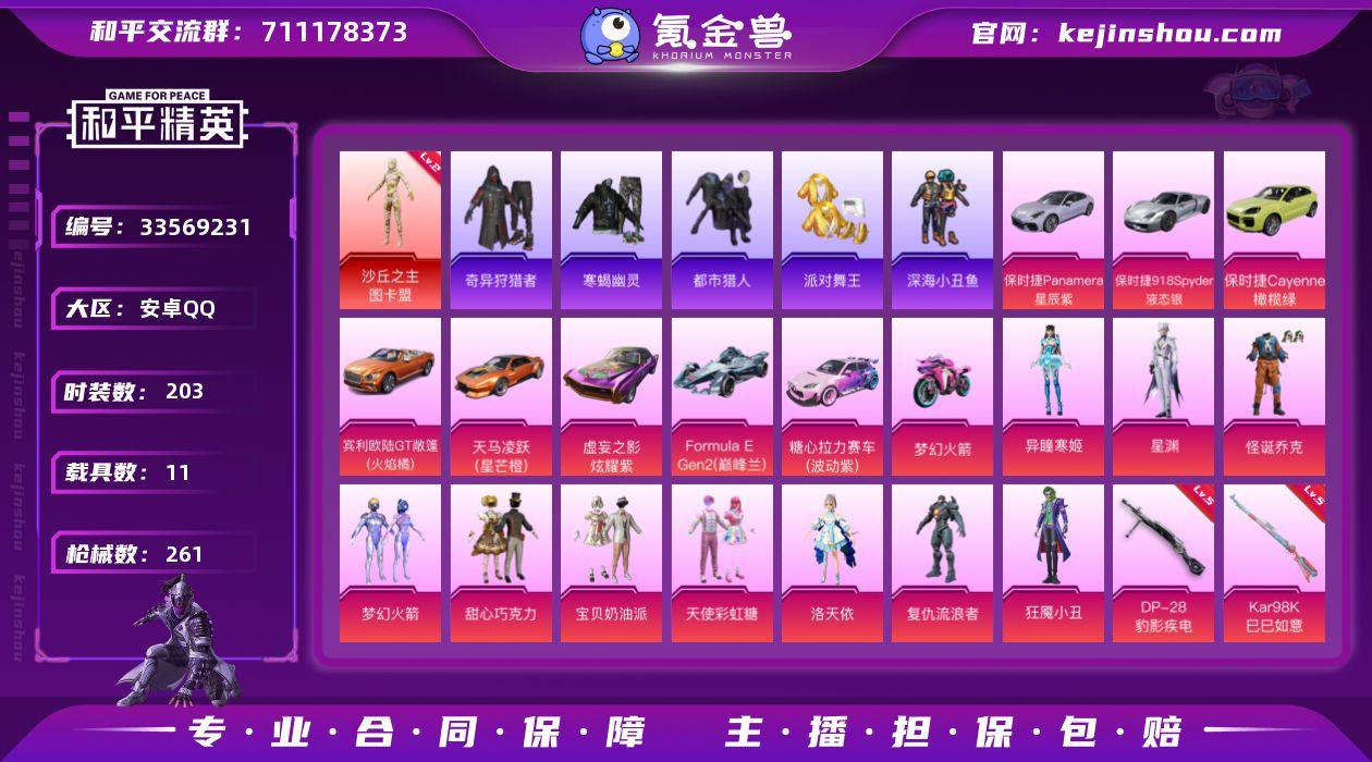 两个红 ss21战神框 僚机 小丑 星梦 金鞋 眼罩 寒蝎 都市 小丑鱼主套 奇异安卓 手Q-无敌战神框-2神装-12粉装-11特效枪-11载具-10粉色飞行器-97731热力值-14王牌印记-203套装-261枪皮 【红色神装等级】:暮色玫影-艾丽娅(一级),沙丘之主-图卡盟(二级) 【红色角色神装】:暮色玫影-艾丽娅,沙丘之主-图卡盟 【热门品类】:粉装-怪诞乔克,粉装-梦幻火箭,套装-寒蝎幽灵,套装-浪漫天命,套装-都市猎人,套装-派对舞王,套装-深海小丑鱼,套装-小丑鱼,套装-奇异狩猎者,套装-暗夜行者,套装-龟仙人,套装-暗影哥特,套装-粉红小猪 【粉色套装】:粉装-怪诞乔克,粉装-甜心巧克力,粉装-宝贝奶油派,粉装-天使彩虹糖,粉装-梦幻火箭,角色-洛天依,角色-复仇流浪者,角色-狂魇小丑,角色-星渊,角色-异瞳寒姬,粉装-光之祷告,角色-月中灵 【粉色枪皮等级】:AKM-暮色玫影(三级),AUG-星梦奇缘(三级),UMP45-萌骑冒险(三级),AKS-74U-森灵之息(五级),P90-沙丘之主(三级),Kar98K-巳巳如意(五级),Mk14-爆裂游戏(三级),Mk14-福马献瑞(五级),M200-梦海之灵(一级),DP-28-豹影疾电(五级) 【粉色载具】:宾利欧陆GT敞篷(火焰橘),天马凌跃(星芒橙),保时捷Panamera(星辰紫)...